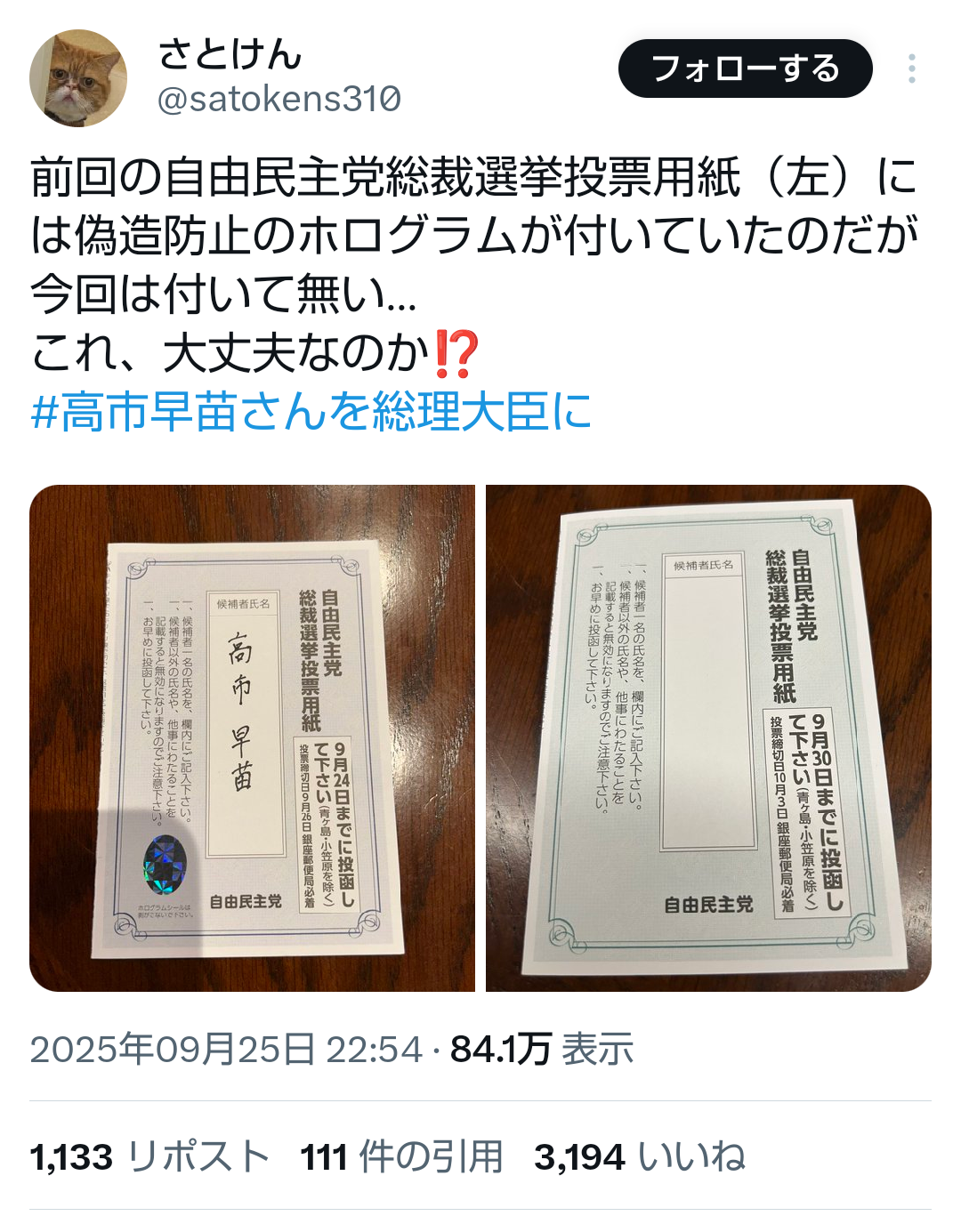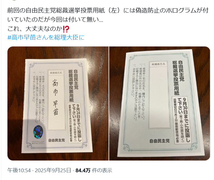 … | 569無題Name名無し 25/10/03(金)00:15:52No.748450+事実かどうか知らんけどなんか今回の総裁選投票用紙は偽造防止のホロ加工が消えてるんだって |