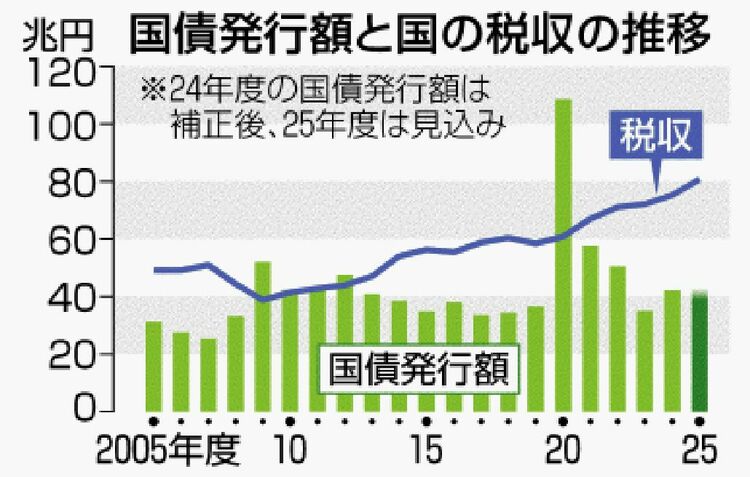 ただ、25年度の補正予算後の国債発行額は、当初予算段階の28・6兆円から膨らむものの、24年度の補正後(42・1兆円)は上回らない額に抑える方針だ。