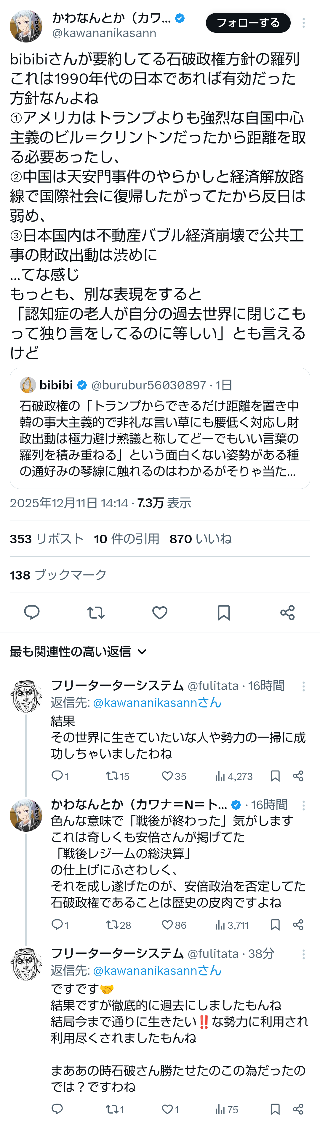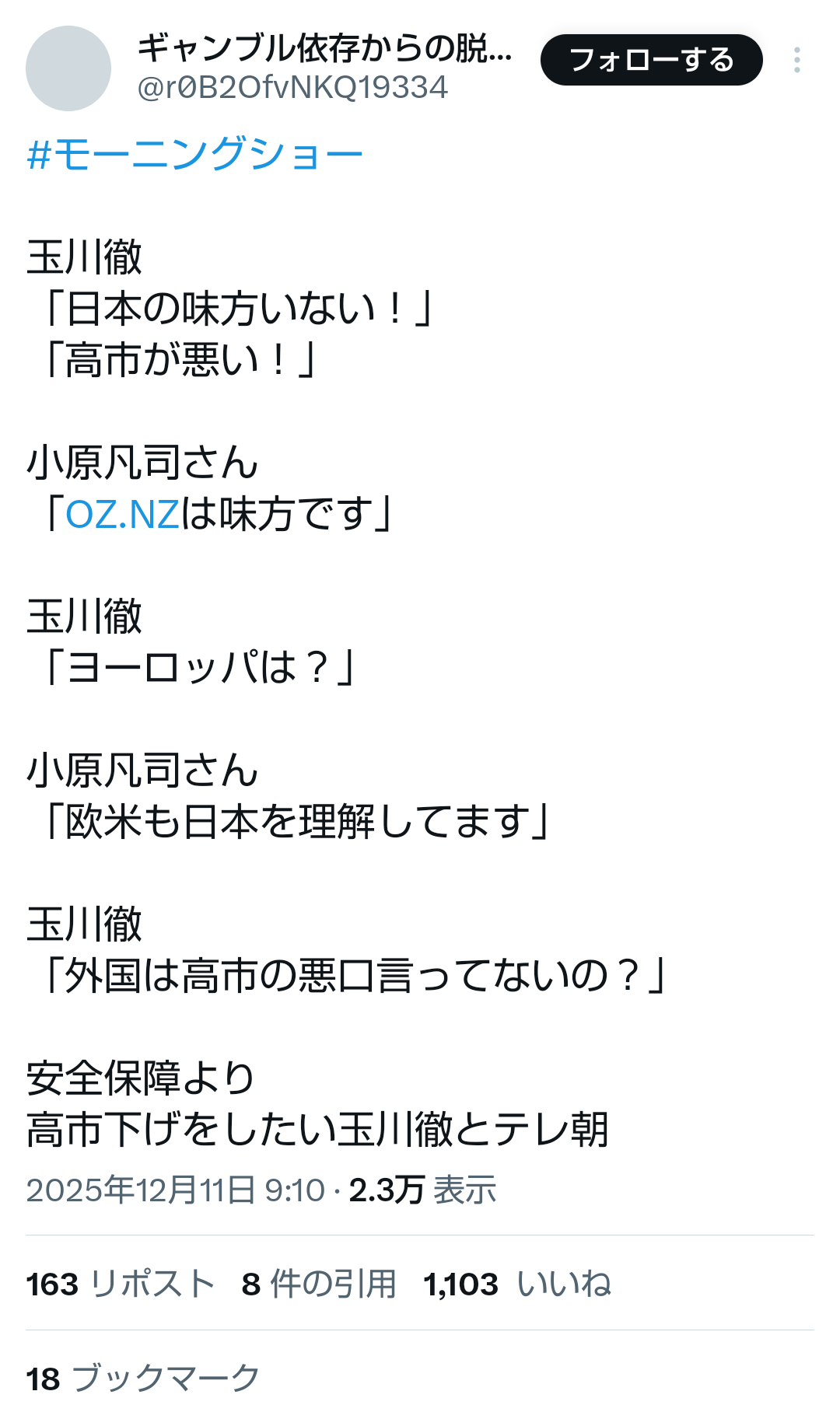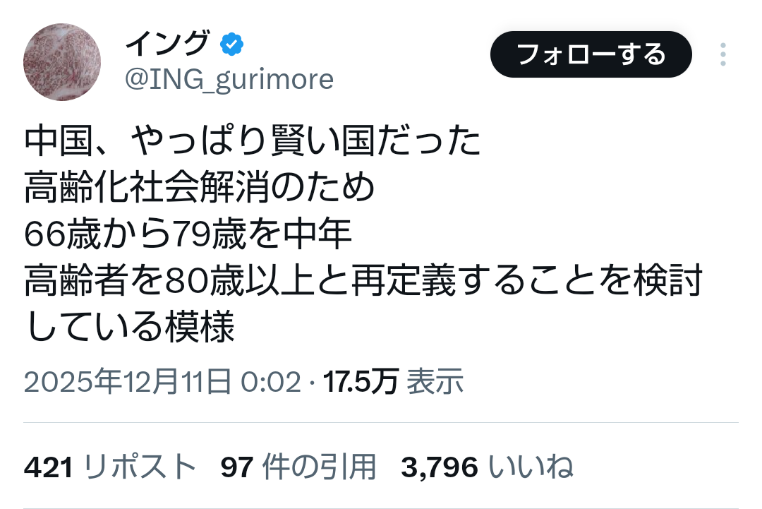 | … | 315無題Name名無し 25/12/13(土)22:20:52No.765089+ 1765632052548.png-(2057315 B) https://x.com/i/status/1999627348992577878 |