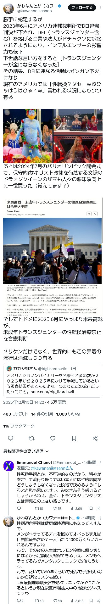 | … | 5無題Name名無し 25/12/11(木)12:37:06No.764664そうだねx1 1765424226626.jpg-(250790 B) >性別適合手術は健康保険適用にもなってますんで、 |