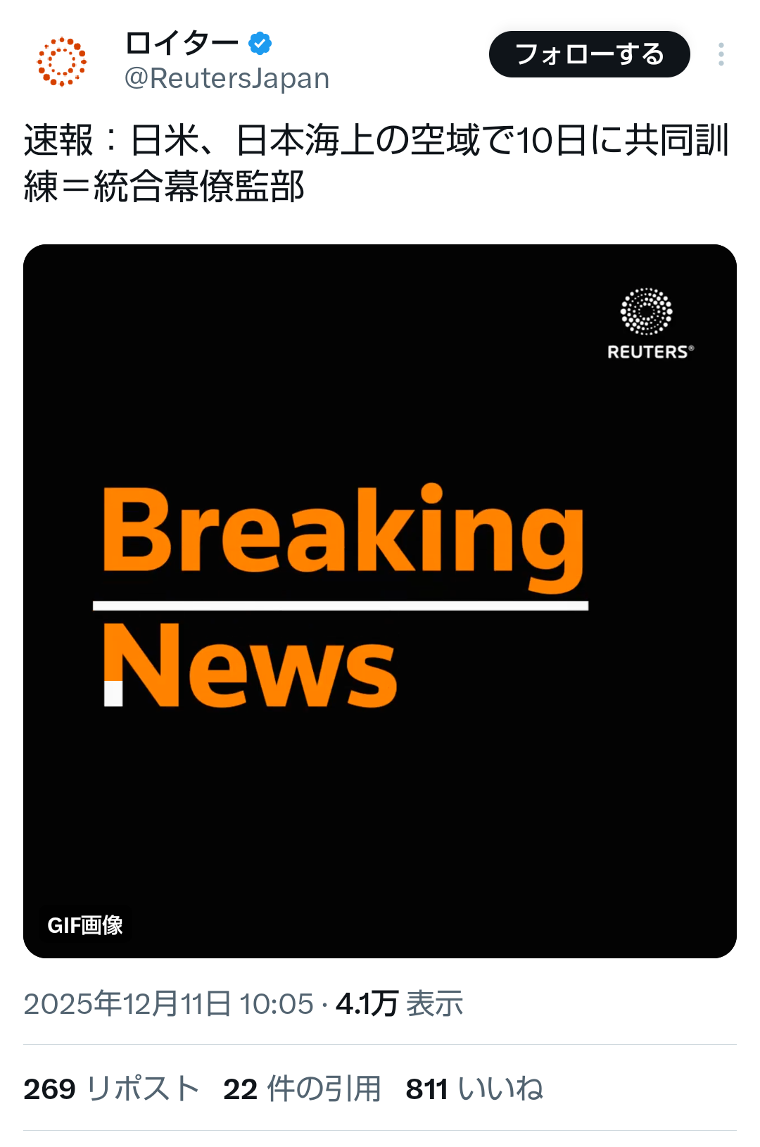 | … | 10無題Name名無し 25/12/11(木)12:56:03No.764669そうだねx1 1765425363754.png-(215593 B) >速報:日米、日本海上の空域で10日に共同訓練=統合幕僚監部 |