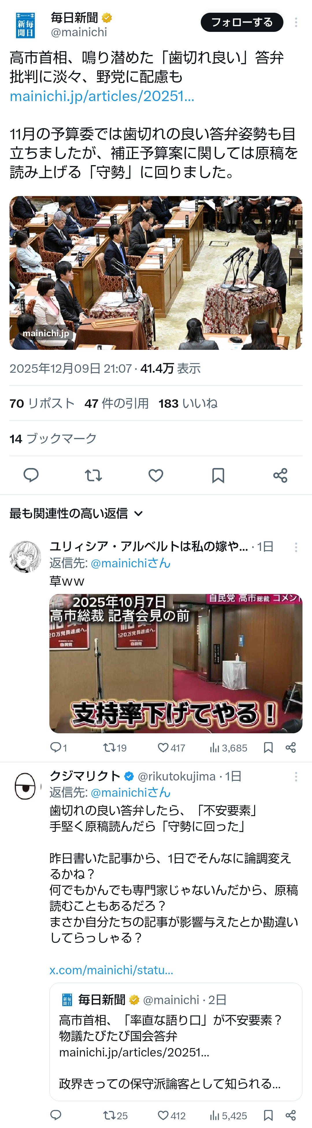 | … | 47無題Name名無し 25/12/11(木)18:09:48No.764709そうだねx2 1765444188104.png-(1960134 B) >高市首相、鳴り潜めた「歯切れ良い」答弁 批判に淡々、野党に配慮も |