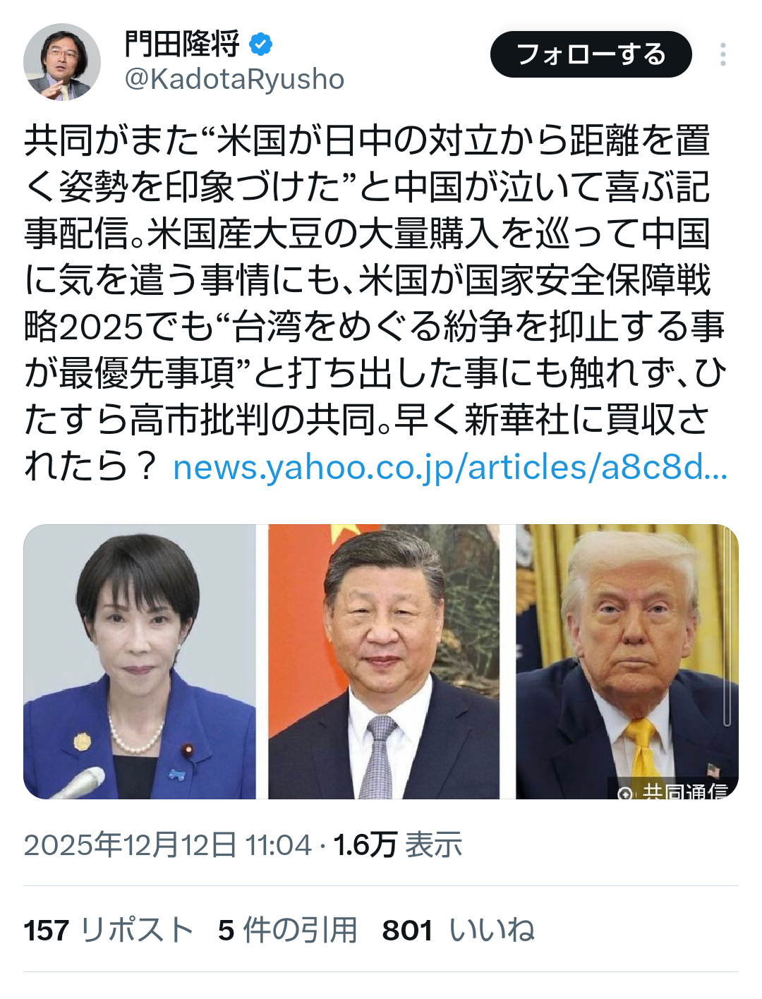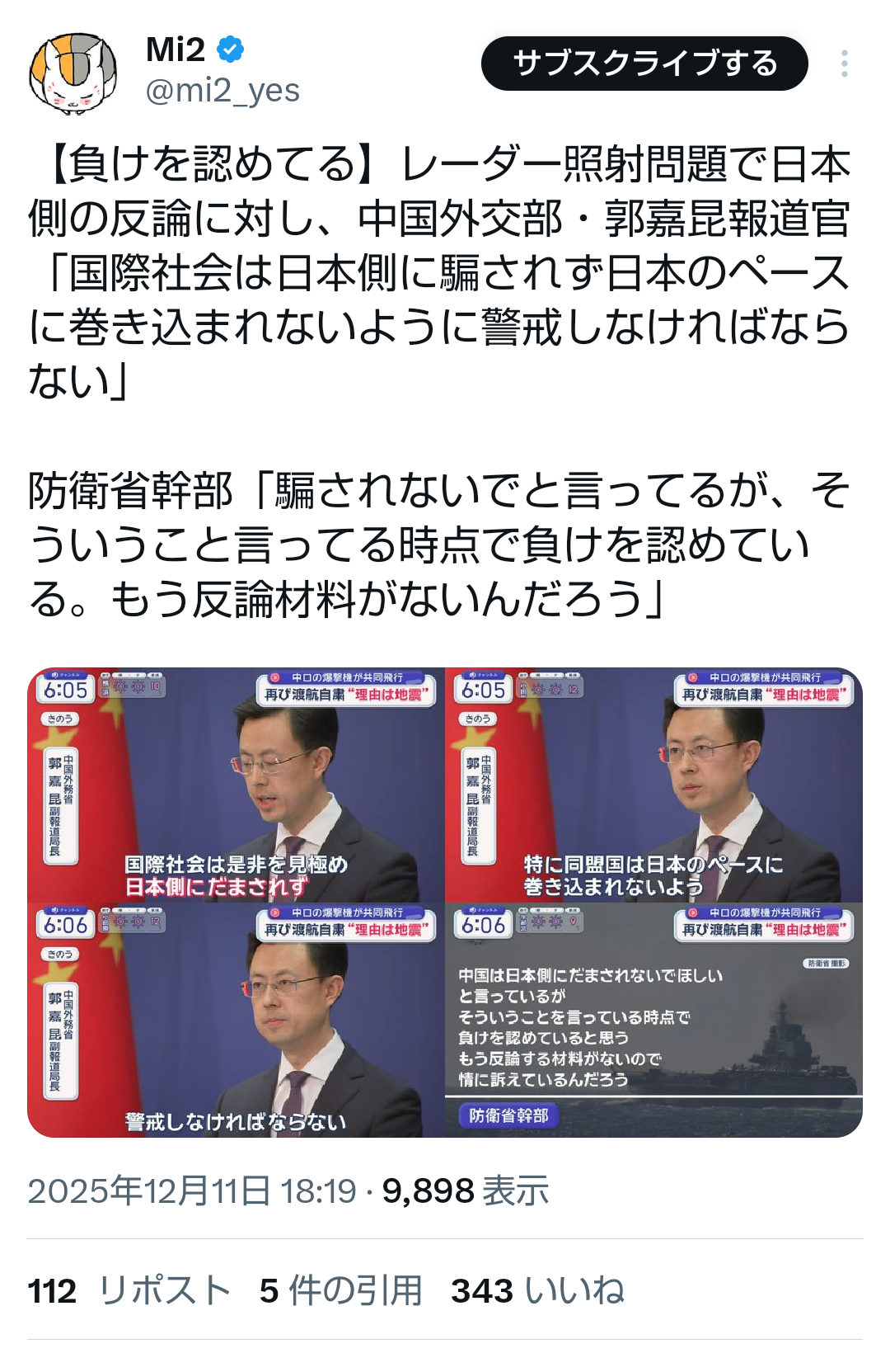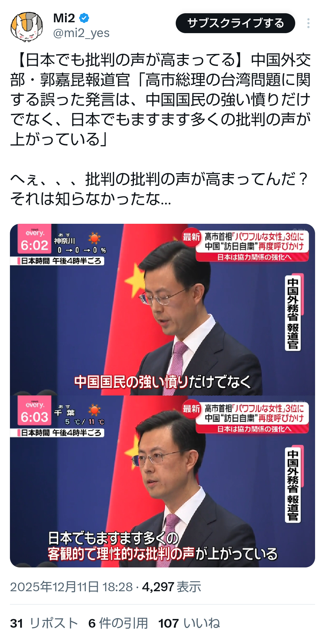 | … | 54無題Name名無し 25/12/11(木)18:50:54No.764716そうだねx3 1765446654619.png-(981076 B) >【日本でも批判の声が高まってる】中国外交部・郭嘉昆報道官「高市総理の台湾問題に関する誤った発言は、中国国民の強い憤りだけでなく、日本でもますます多くの批判の声が上がっている」 |