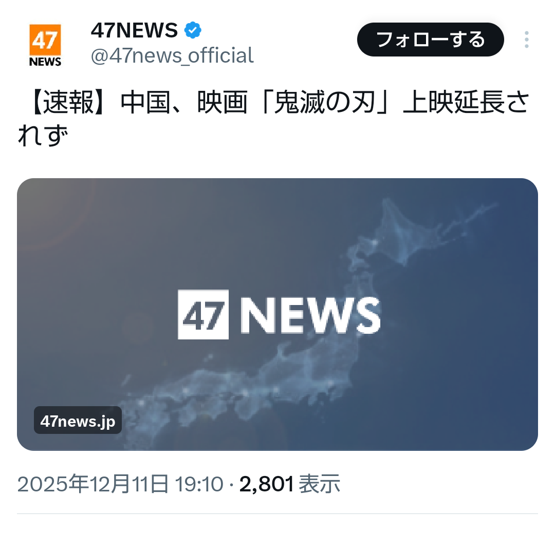 | … | 60無題Name名無し 25/12/11(木)19:49:39No.764731+ 1765450179055.png-(161883 B) >【速報】中国、映画「鬼滅の刃」上映延長されず |