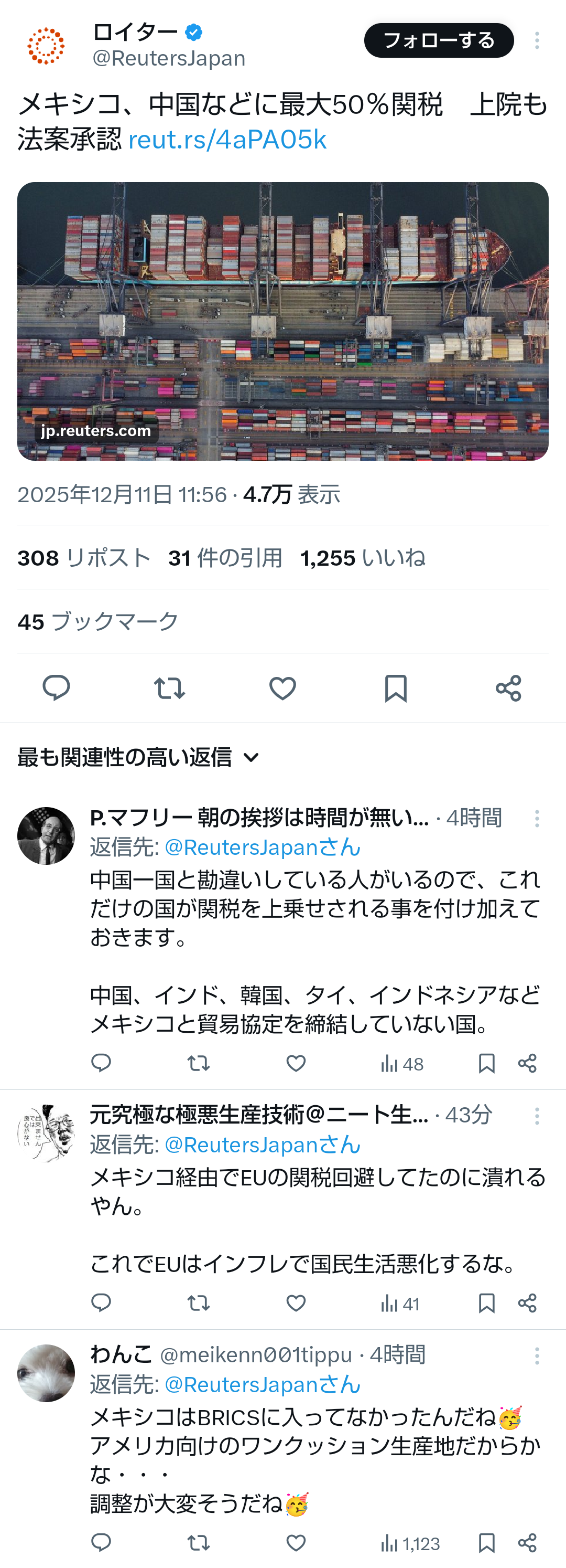 | … | 69無題Name名無し 25/12/11(木)21:14:09No.764749+ 1765455249219.png-(1330255 B) >メキシコ、中国などに最大50%関税 上院も法案承認 |