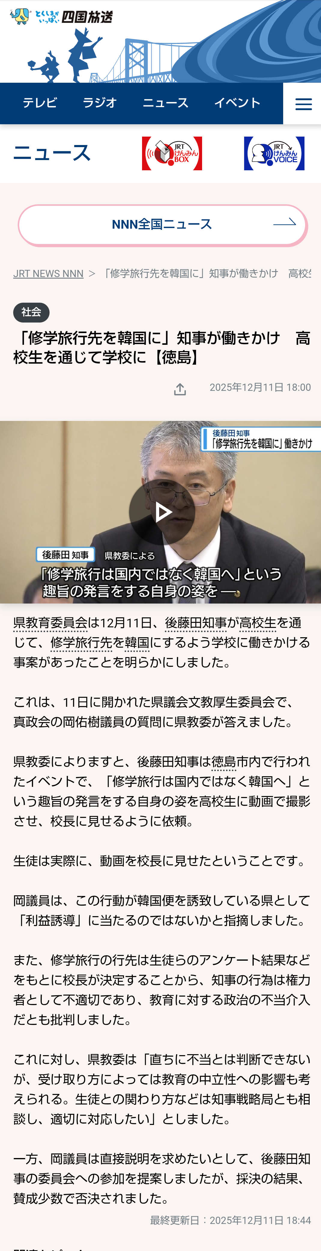 | … | 70無題Name名無し 25/12/11(木)21:38:15No.764750そうだねx9 1765456695527.png-(1270420 B) >「修学旅行先を韓国に」 知事が働きかけ 高校生を通じて学校に【徳島】 |