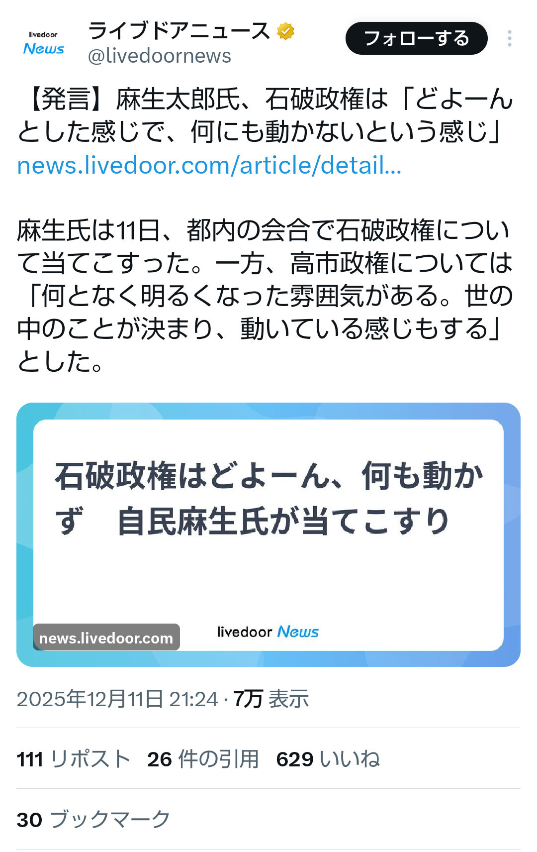 | … | 75無題Name名無し 25/12/11(木)22:28:26No.764755そうだねx2 1765459706732.png-(406216 B) >【発言】麻生太郎氏、石破政権は「どよーんとした感じで、何にも動かないという感じ」(共同) |