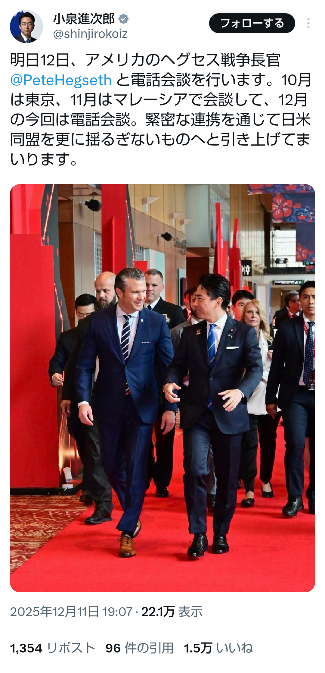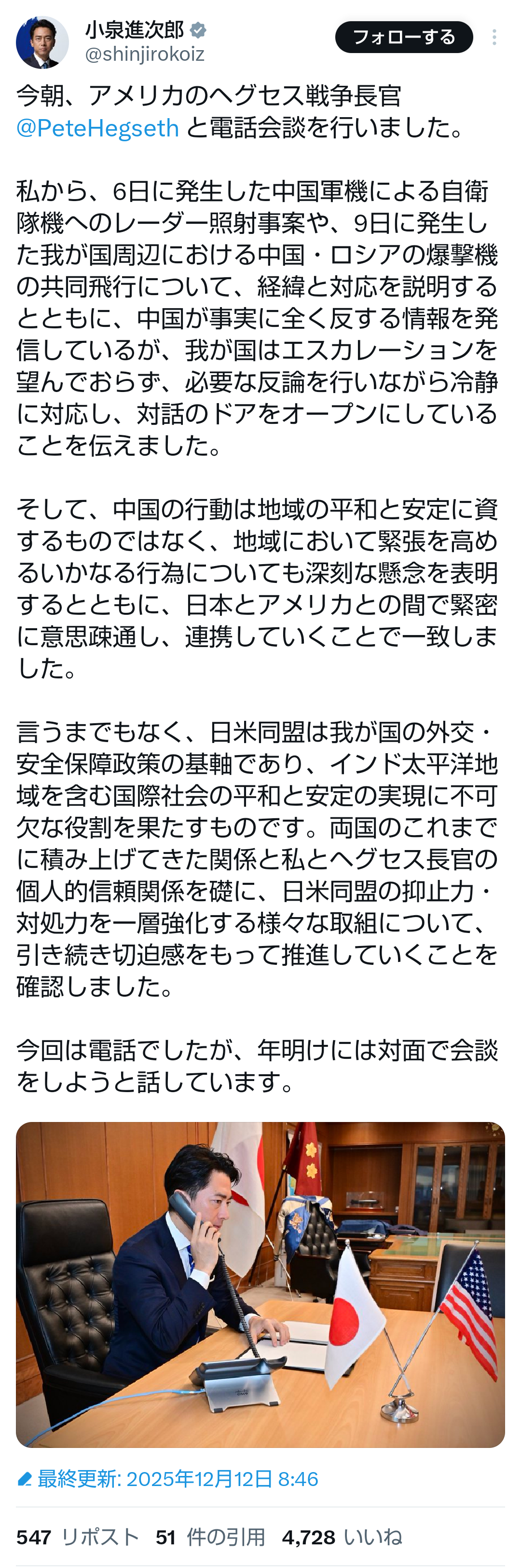 | … | 76無題Name名無し 25/12/11(木)22:35:20No.764756そうだねx5 1765460120631.png-(1774882 B) >明日12日、アメリカのヘグセス戦争長官@PeteHegseth と電話会談を行います。10月は東京、11月はマレーシアで会談して、12月の今回は電話会談。緊密な連携を通じて日米同盟を更に揺るぎないものへと引き上げてまいります。 |