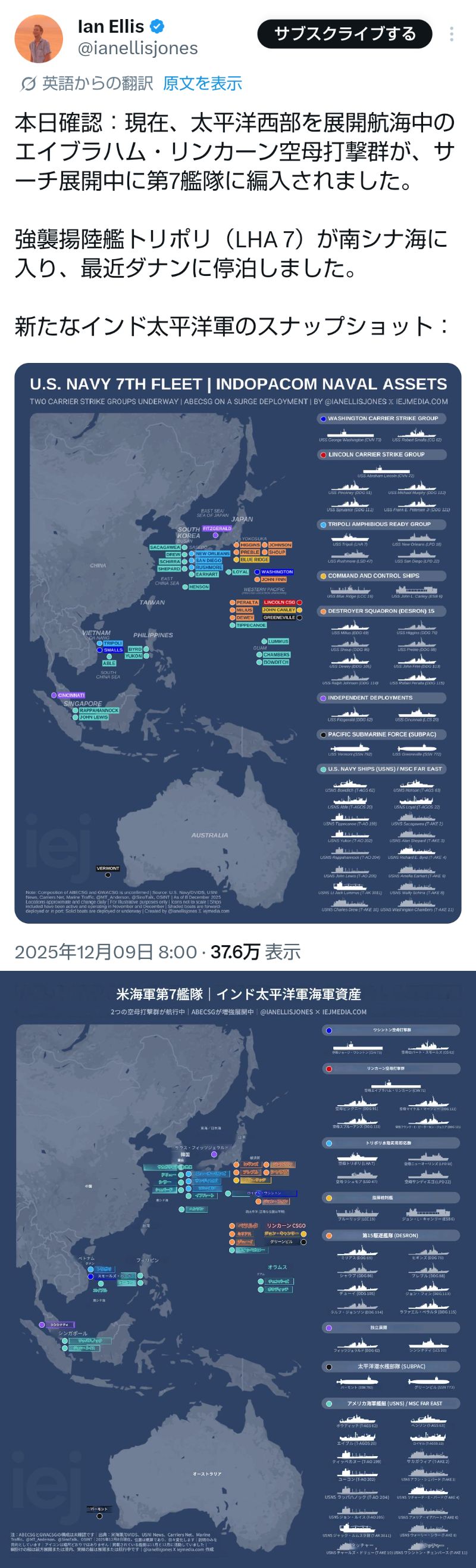 | … | 77無題Name名無し 25/12/11(木)22:41:33No.764757そうだねx4 1765460493729.jpg-(284445 B) >現在、太平洋西部を展開航海中のエイブラハム・リンカーン空母打撃群が、サーチ展開中に第7艦隊に編入された。強襲揚陸艦トリポリ(LHA 7)が南シナ海に入り、最近ダナンに停泊した。 |