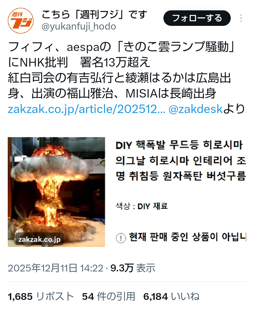 | … | 9無題Name名無し 25/12/11(木)12:48:01No.764668そうだねx10>aespa・ニンニンが「かわいい」と表現した「きのこ雲ランプ」 日本被団協から回答得られず |