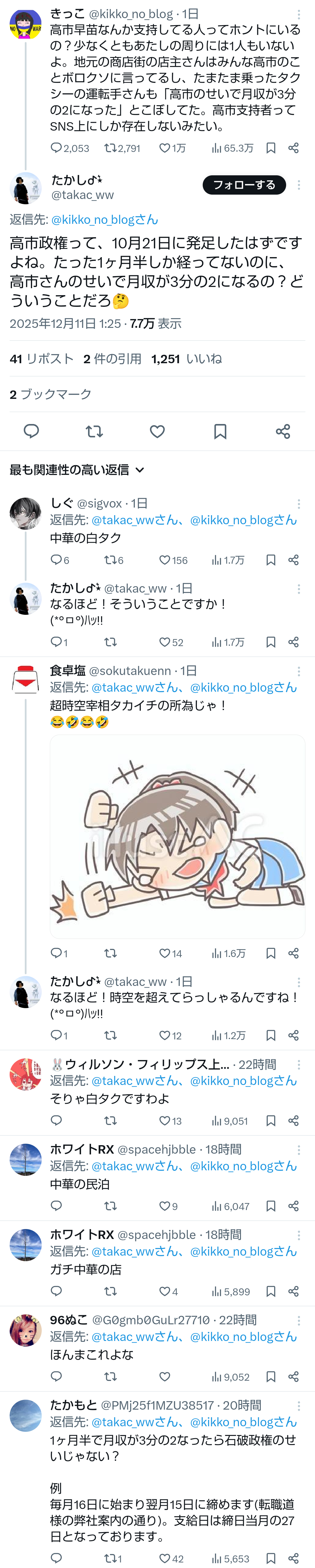 | … | 96無題Name名無し 25/12/12(金)09:07:36No.764782そうだねx4>白タクか民泊か中国人向けオンリーの店が壊滅的な売上になったのか |