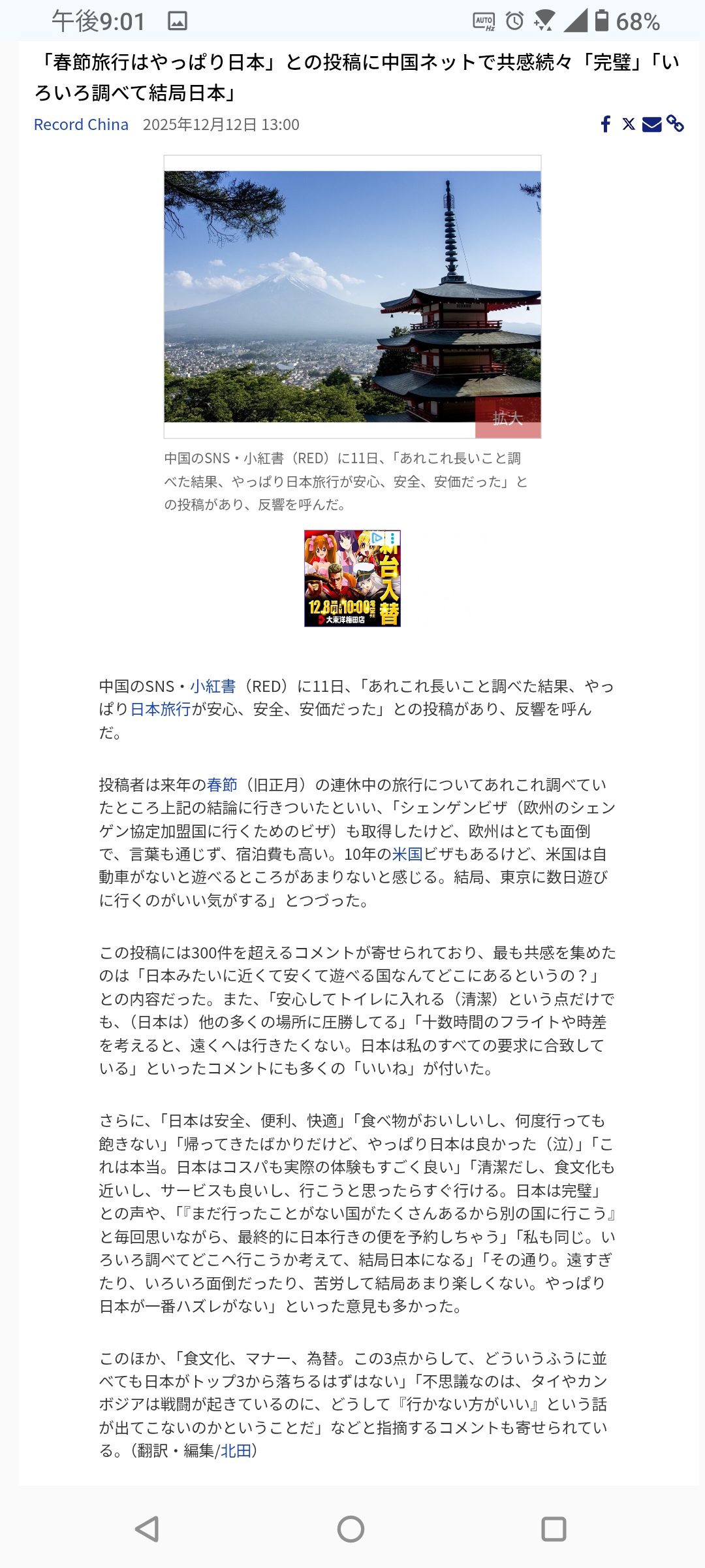 | … | 94無題Name名無し 25/12/12(金)09:01:21No.764780そうだねx1>中国人が訪日してないって証拠じゃん |