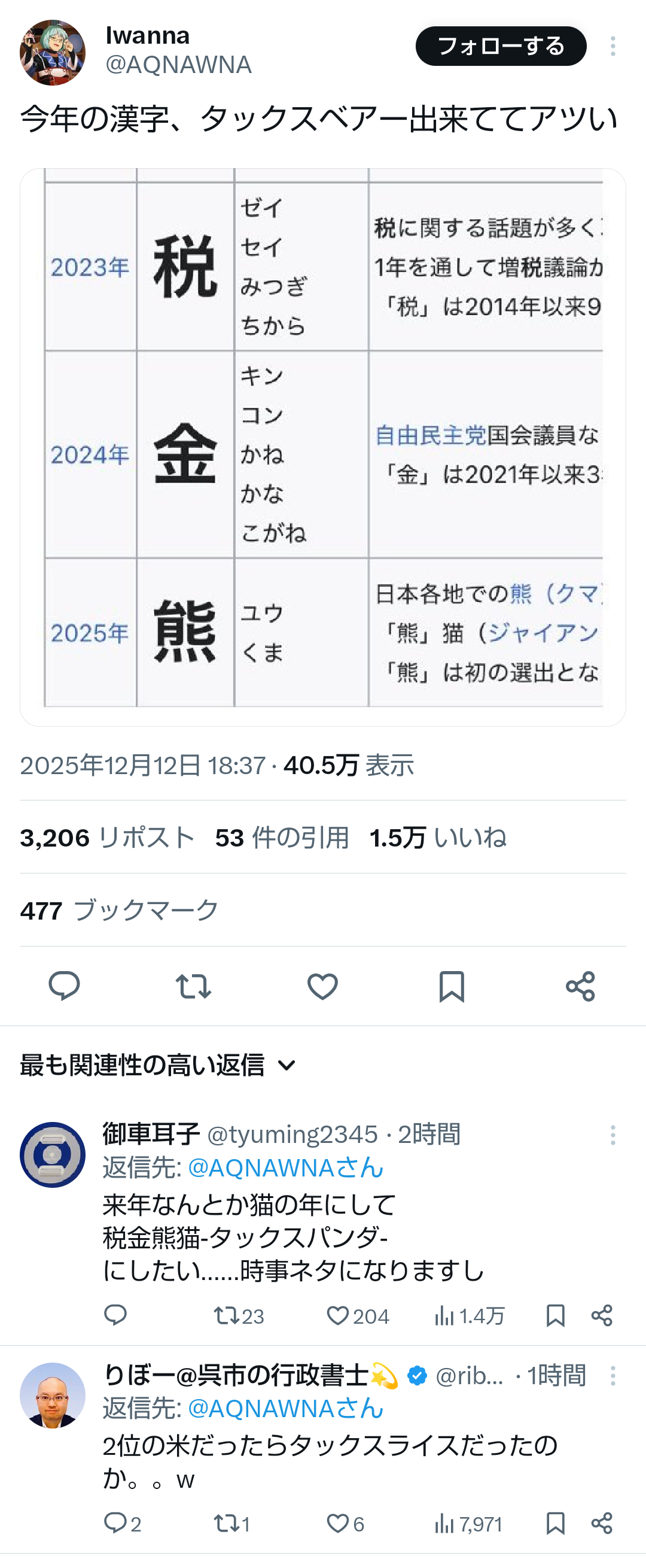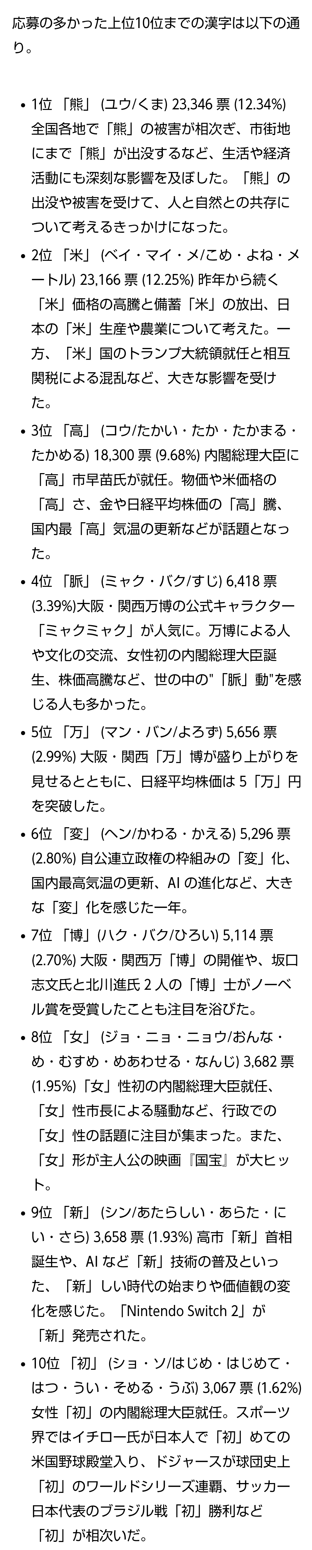 | … | 253無題Name名無し 25/12/13(土)12:56:25No.765012そうだねx1>日本の今年の漢字は「熊」です |