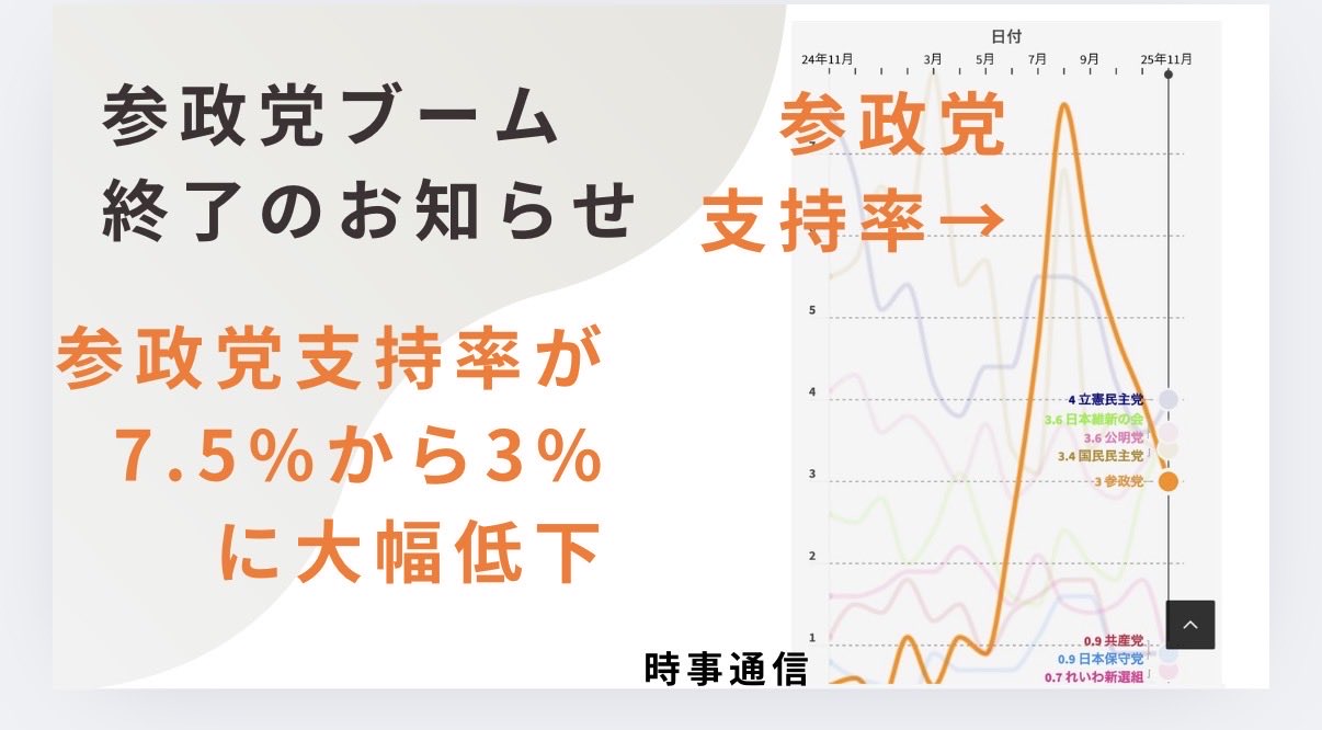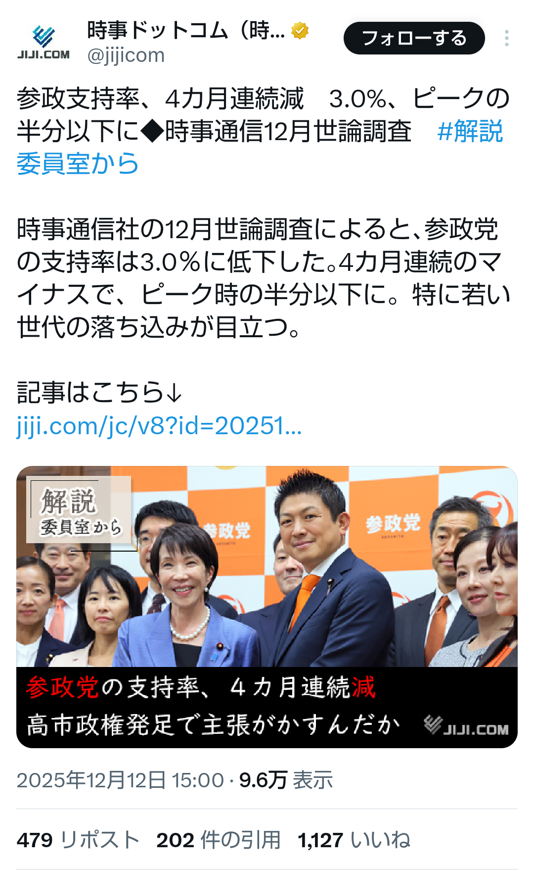 | … | 264無題Name名無し 25/12/13(土)14:14:03No.765024+参政党についてはここで予想した通り高市さんになったら保守層が自民に戻るってやつになってるな |