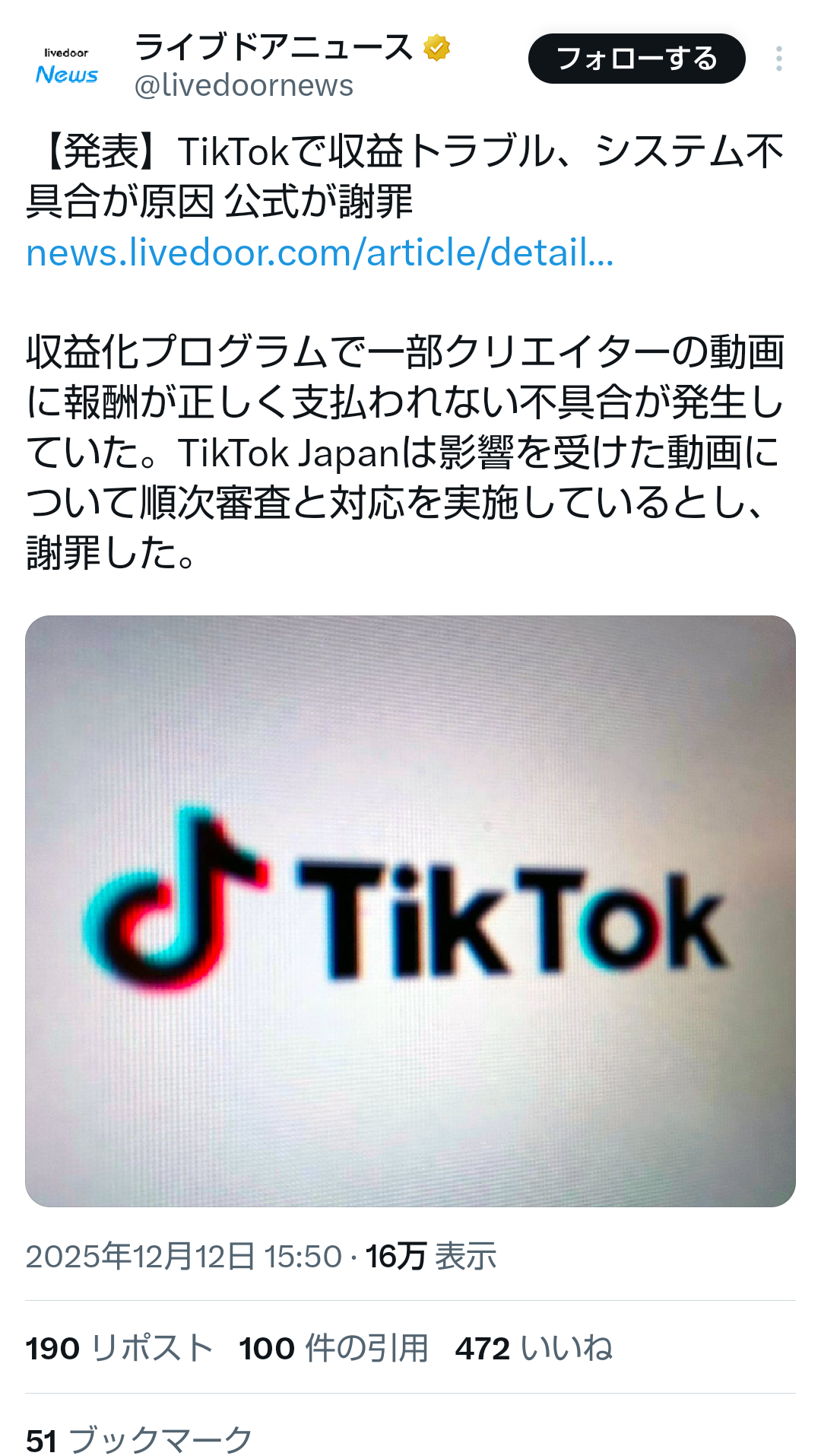 | … | 274無題Name名無し 25/12/13(土)15:24:50No.765034そうだねx6>>というかLINEもだけどいつのまにか日本でも当たり前のように使われる定番ツールみたいなことになってるよねtiktok |