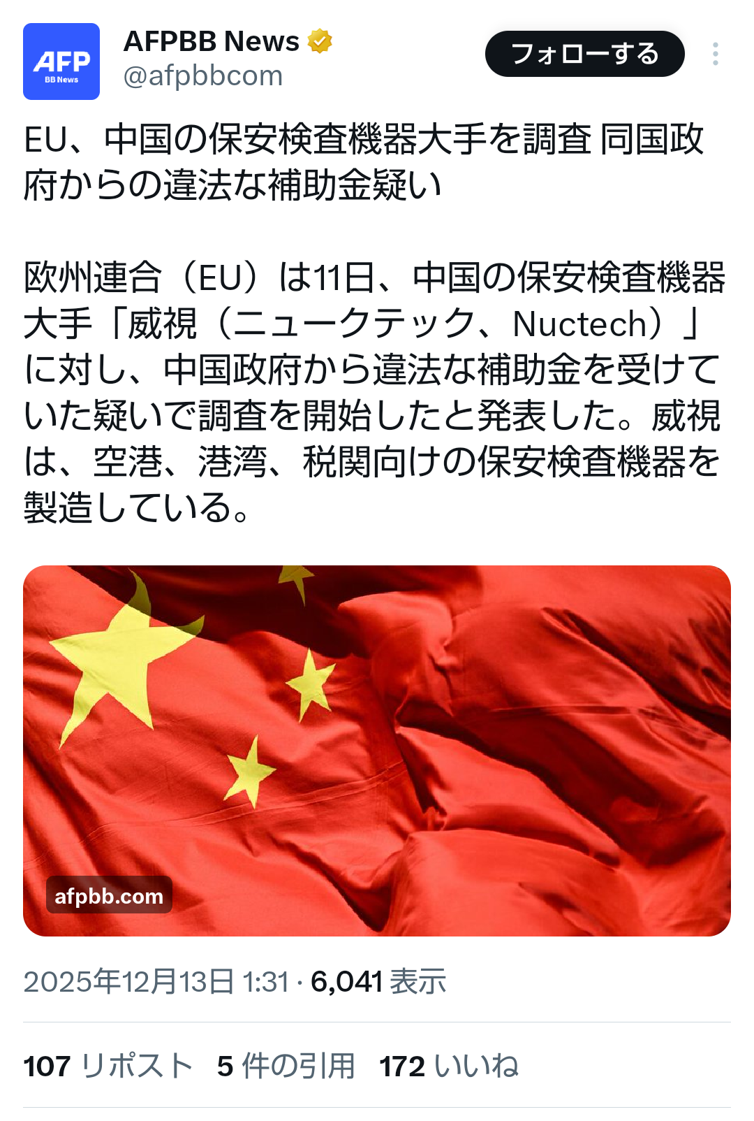 | … | 251無題Name名無し 25/12/13(土)12:46:31No.765010+ 1765597591266.png-(840334 B) >EU、中国の保安検査機器大手を調査 同国政府からの違法な補助金疑い |