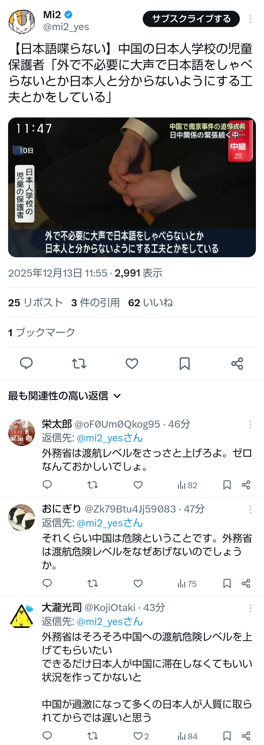 | … | 268無題Name名無し 25/12/13(土)14:31:06No.765028そうだねx4>【日本語喋らない】中国の日本人学校の児童保護者「外で不必要に大声で日本語をしゃべらないとか日本人と分からないようにする工夫とかをしている」 |