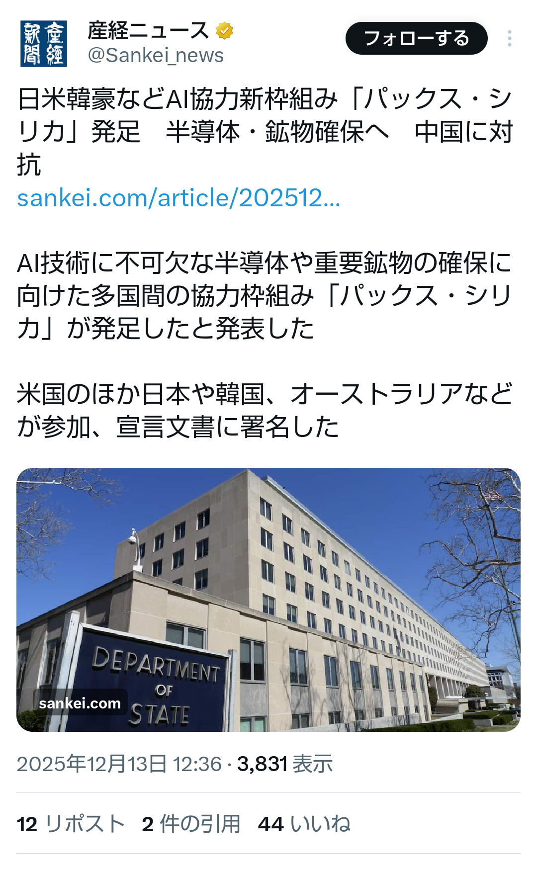| … | 259無題Name名無し 25/12/13(土)13:12:20No.765018そうだねx1 1765599140082.png-(944914 B) >日米韓豪などAI協力新枠組み「パックス・シリカ」発足 半導体・鉱物確保へ 中国に対抗 |