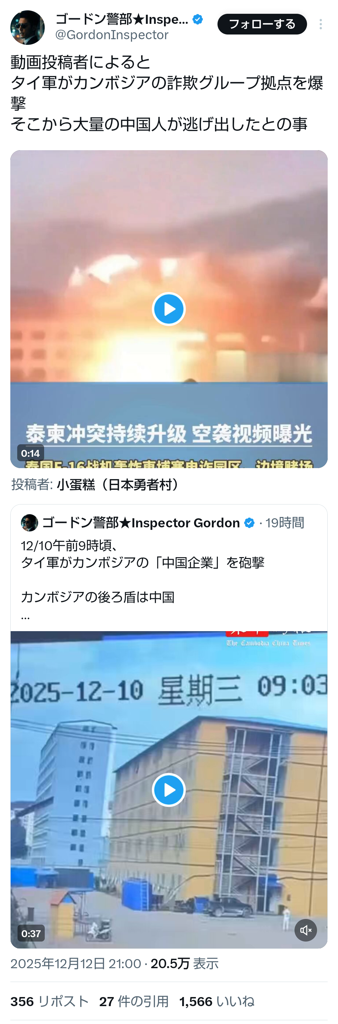 | … | 67無題Name名無し 25/12/11(木)20:45:07No.764747そうだねx3>【速報】タイとカンボジア衝突で60万人避難と両国 |
