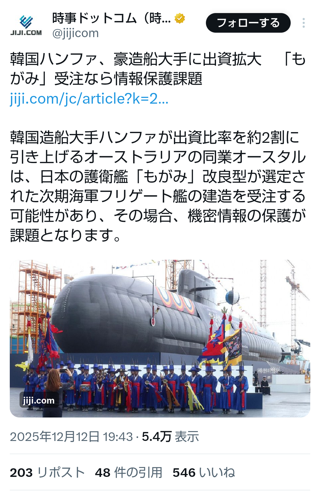 | … | 280無題Name名無し 25/12/13(土)16:37:18No.765047そうだねx4 1765611438666.png-(1005426 B) >韓国ハンファ、豪造船大手に出資拡大 「もがみ」受注なら情報保護課題 |