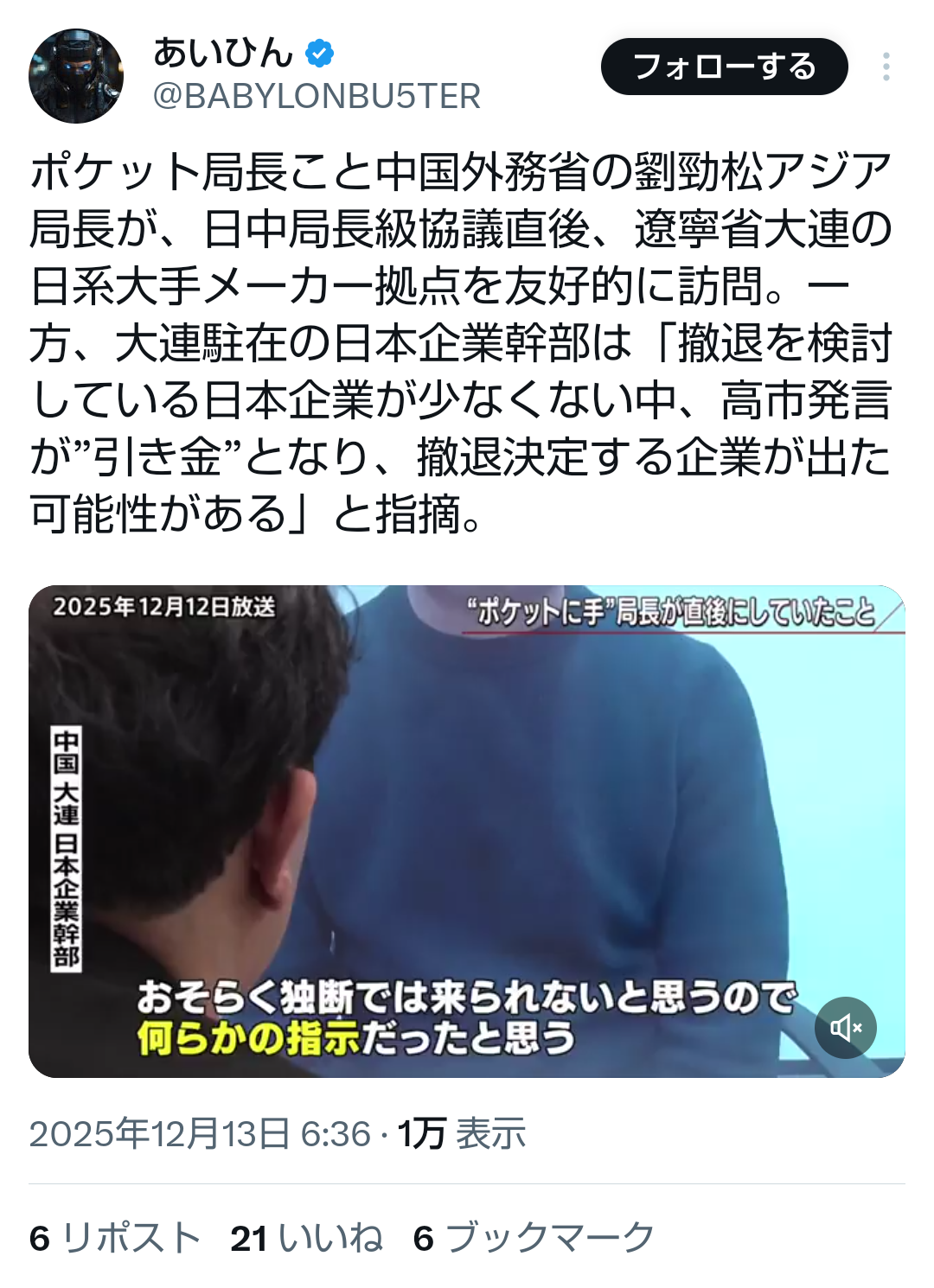 | … | 292無題Name名無し 25/12/13(土)17:58:50No.765064+ 1765616330947.png-(683924 B) >ポケット局長こと中国外務省の劉勁松アジア局長が、日中局長級協議直後、遼寧省大連の日系大手メーカー拠点を友好的に訪問。一方、大連駐在の日本企業幹部は「撤退を検討している日本企業が少なくない中、高市発言が”引き金”となり、撤退決定する企業が出た可能性がある」と指摘。 |