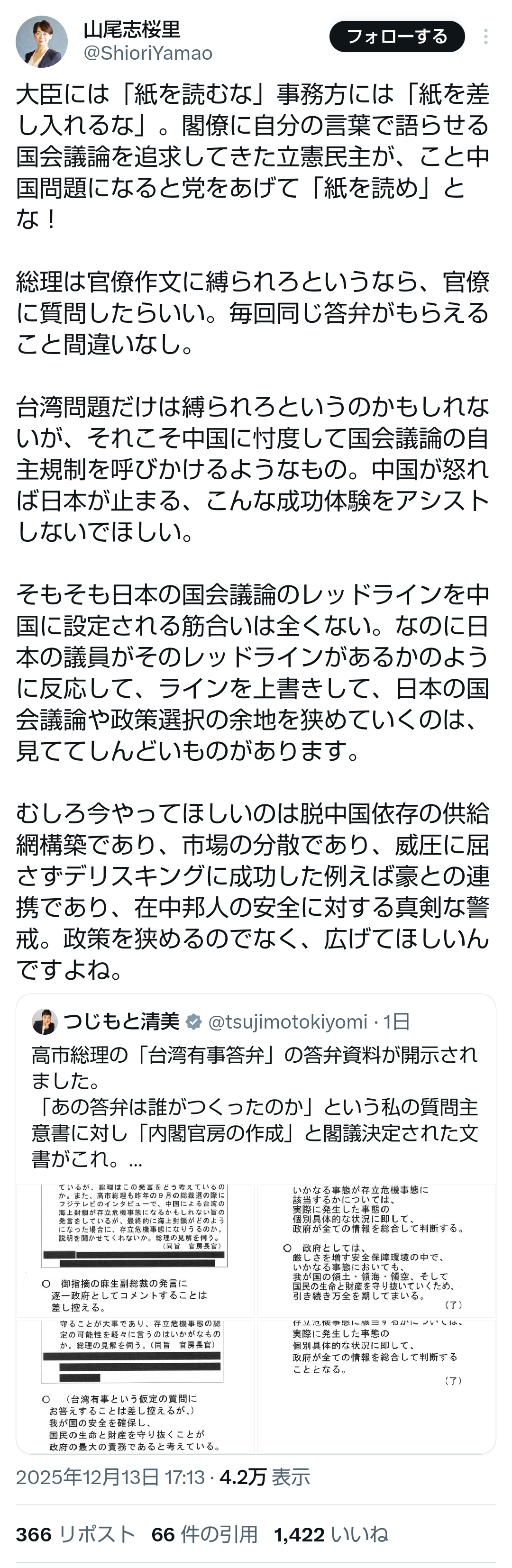 | … | 293無題Name名無し 25/12/13(土)18:25:12No.765065そうだねx1 1765617912398.png-(1123726 B) >大臣には「紙を読むな」事務方には「紙を差し入れるな」。閣僚に自分の言葉で語らせる国会議論を追求してきた立憲民主が、こと中国問題になると党をあげて「紙を読め」とな! |