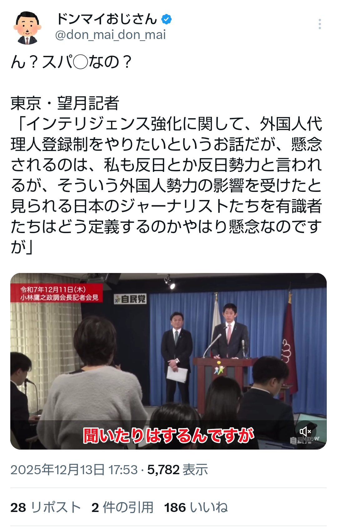 | … | 299無題Name名無し 25/12/13(土)20:53:06No.765072そうだねx1日本においては「有識者」はスパイとは言わんだろとは思ったり… |