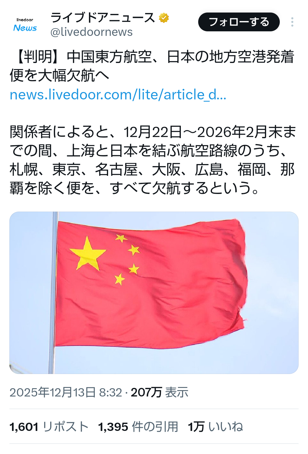 | … | 303無題Name名無し 25/12/13(土)21:36:04No.765077+中国からの航空便が減って自称中華人民観光客って犯罪旅行者連中が日本に物理的に来れなくなるのは良い事ですねぇ…問題は今現在中国に残ってる日本人の引き上げ難度が上がる事だわな |