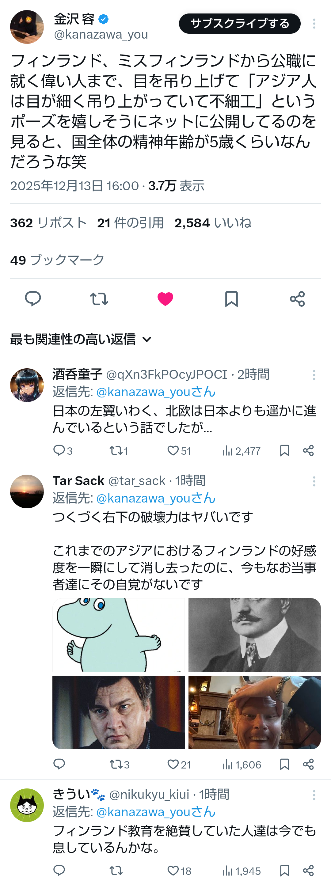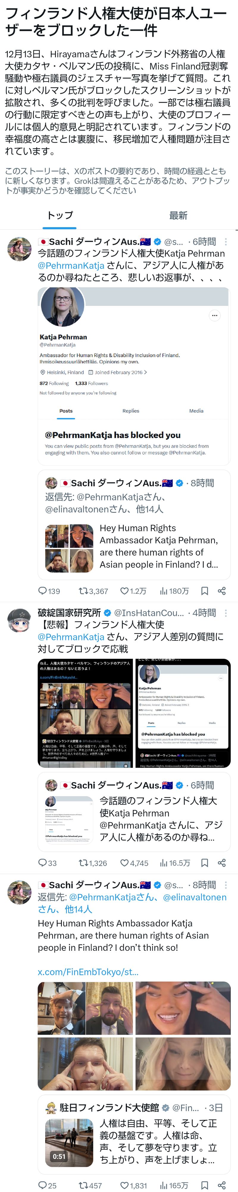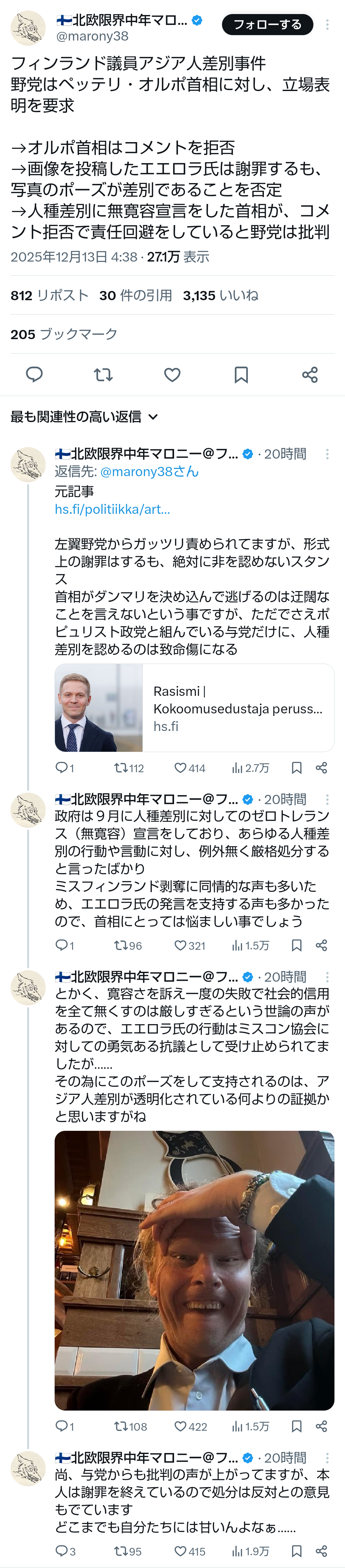 | … | 333無題Name名無し 25/12/14(日)00:53:00No.765108+ 1765641180233.png-(1719819 B) >フィンランド議員アジア人差別事件 |