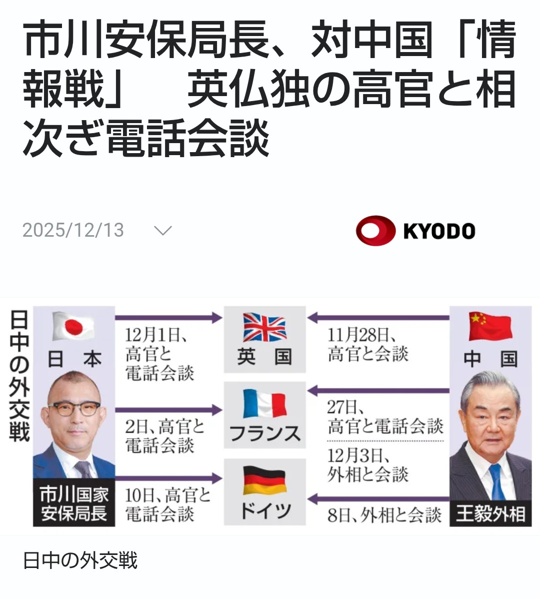 | … | 312無題Name名無し 25/12/13(土)22:13:30No.765086+ 1765631610173.jpg-(179598 B) >市川安保局長、対中国「情報戦」 英仏独の高官と相次ぎ電話会談 |