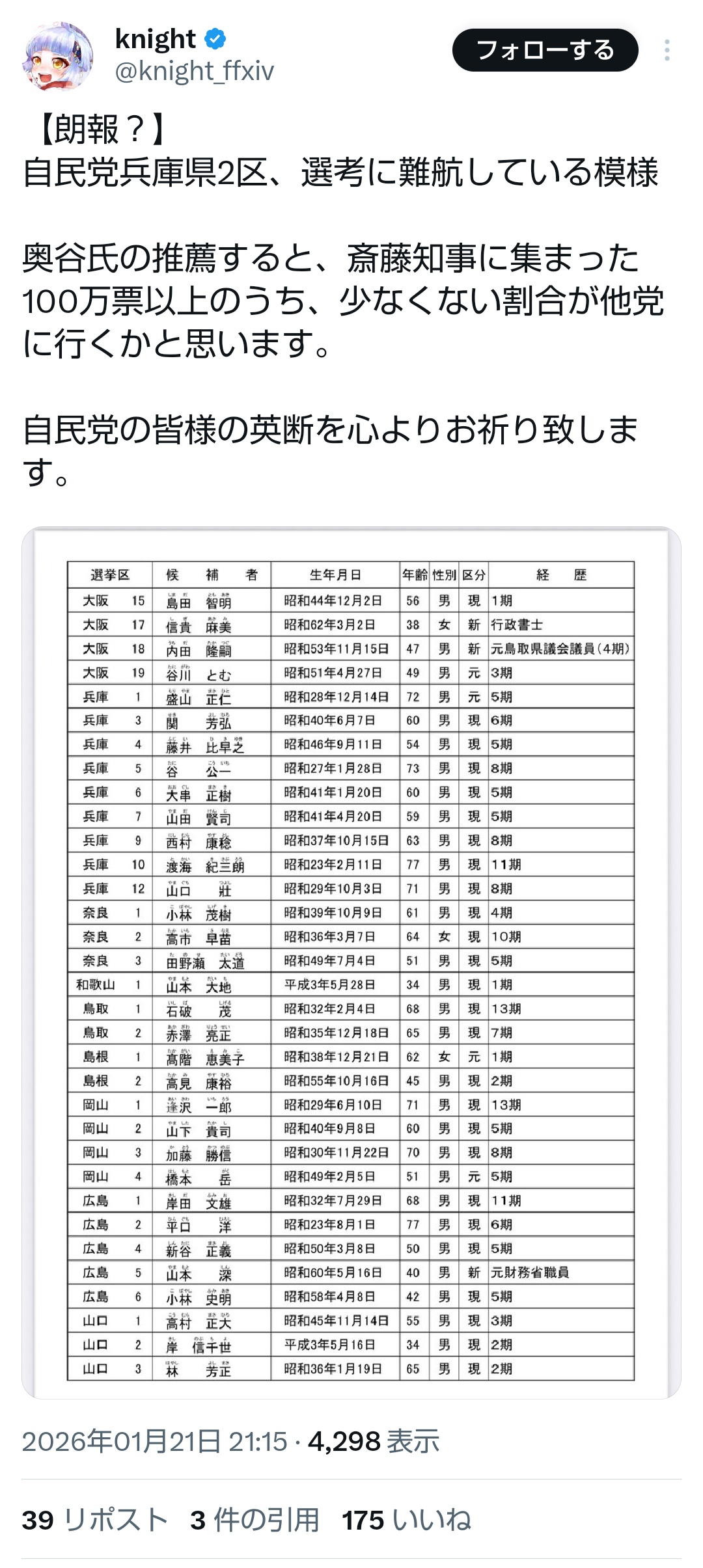 | … | 984無題Name名無し 26/01/25(日)23:20:20No.774296+福井1区の稲田ヤバそう言われてんな |