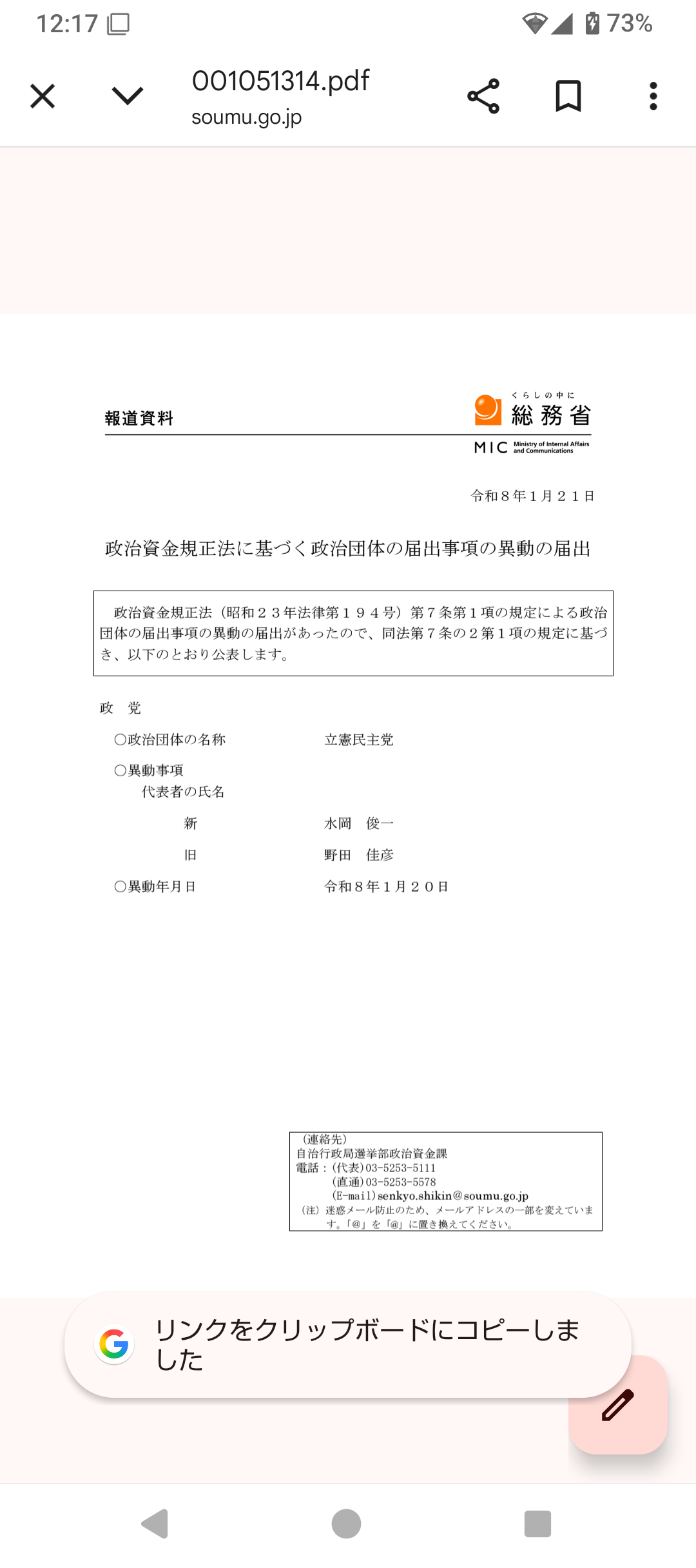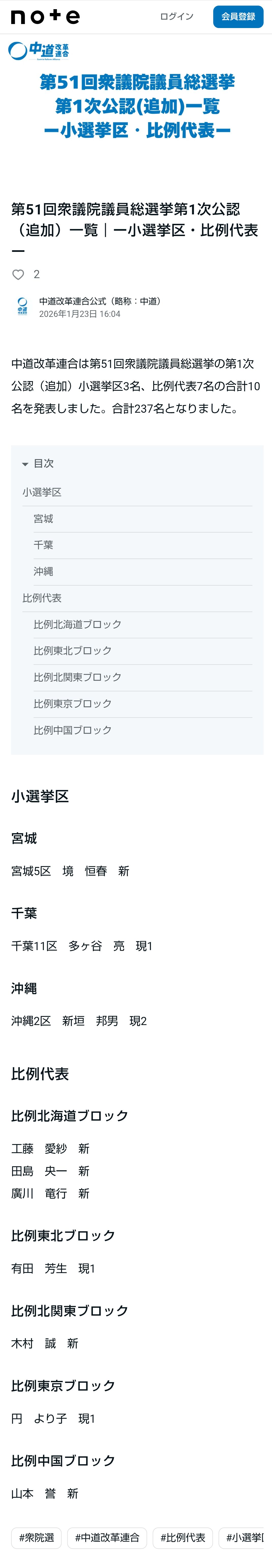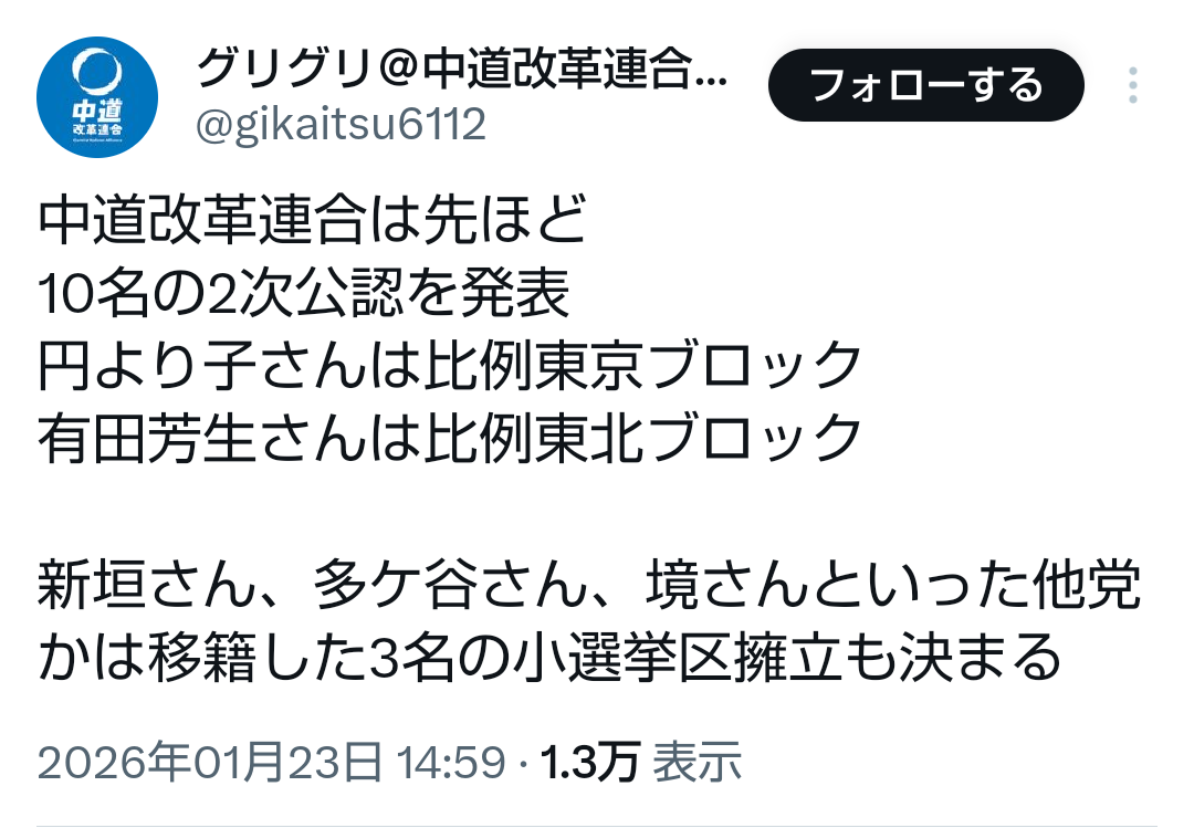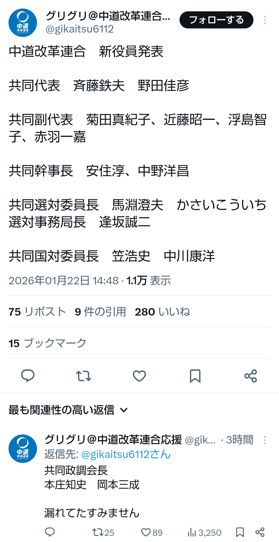 | … | 60無題Name名無し 26/01/22(木)12:24:11No.773258+総務省の報道資料からすると立憲野田の方が先に提出してるみたいだね |