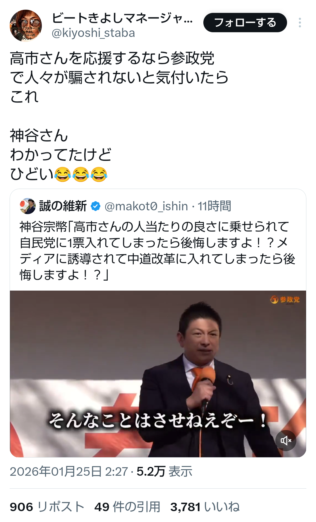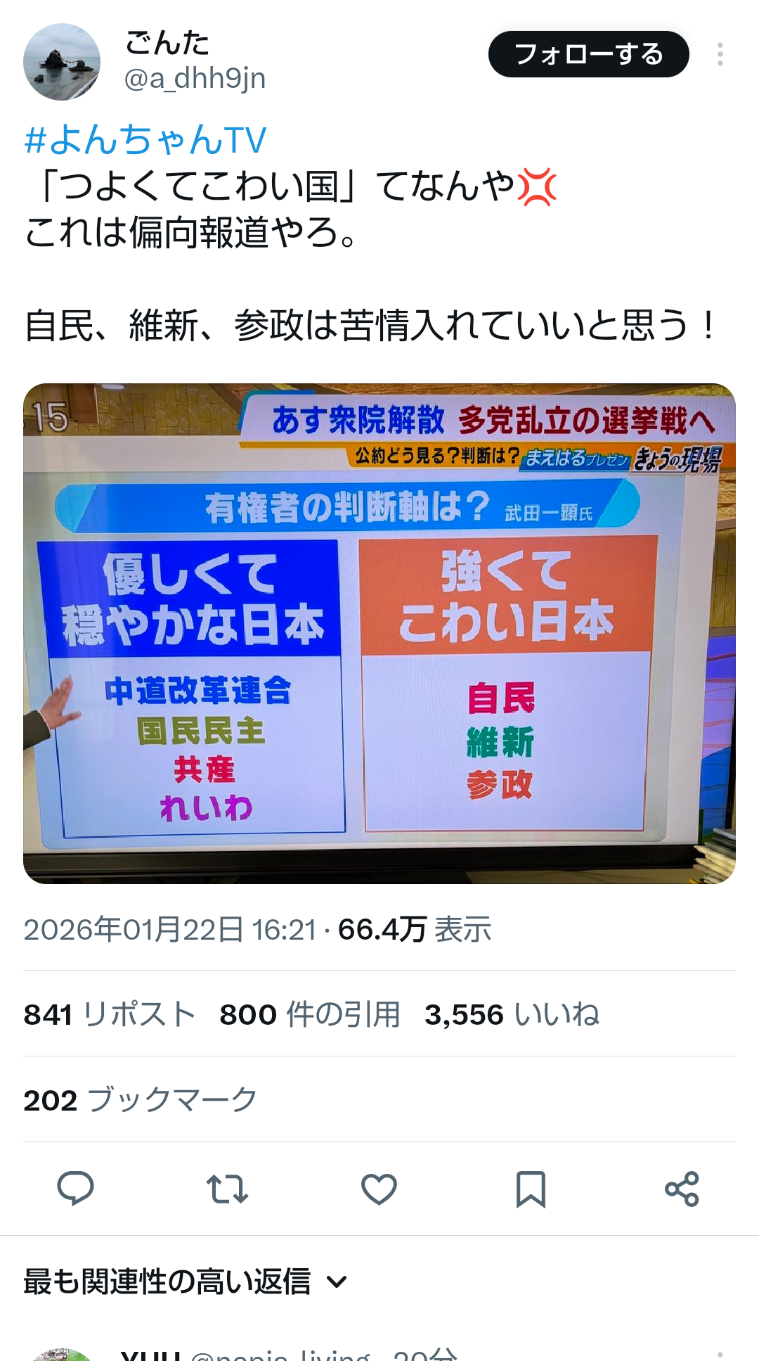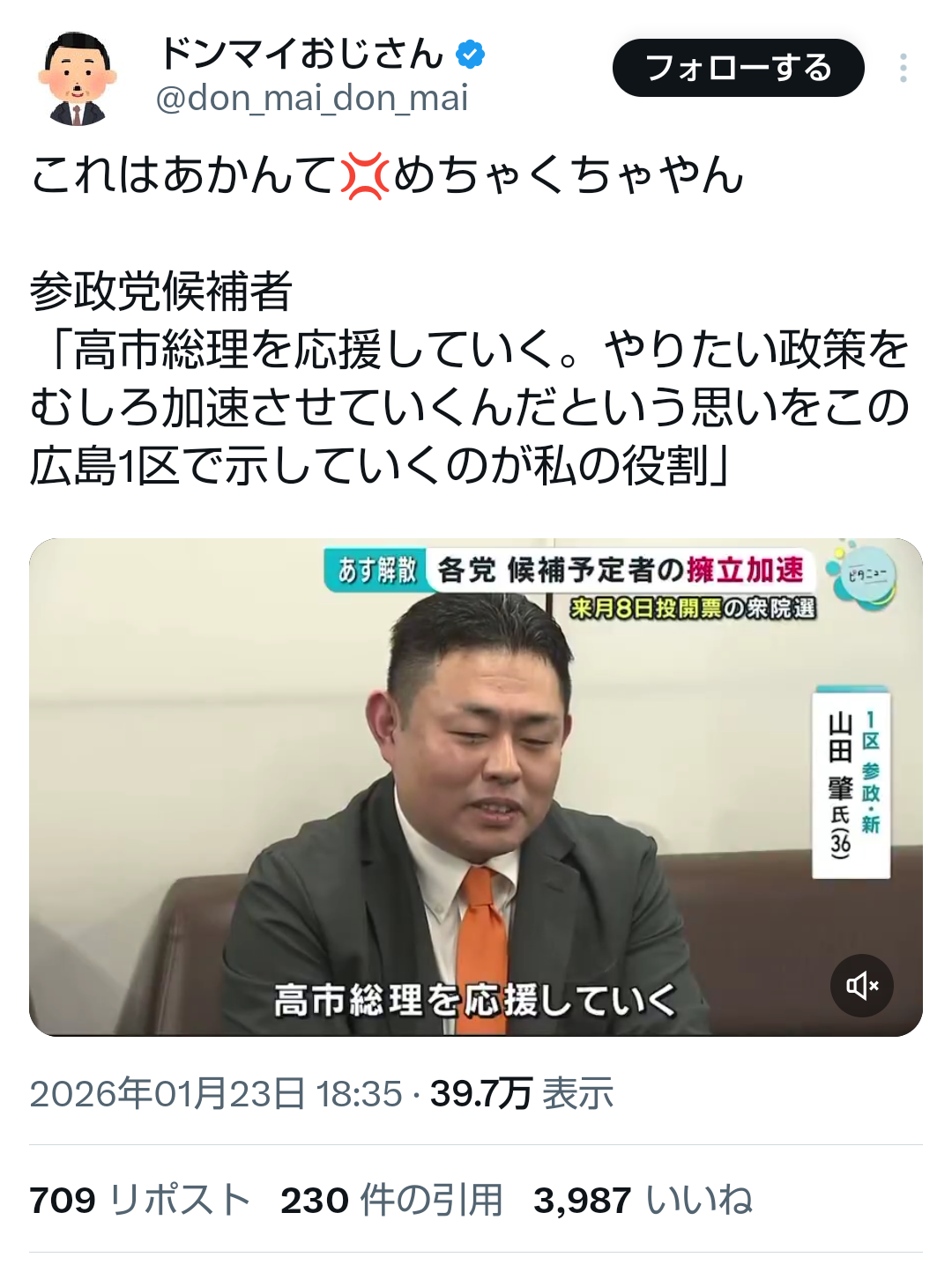 | … | 983無題Name名無し 26/01/25(日)23:15:08No.774295+参政党は選挙は強いんだよな |