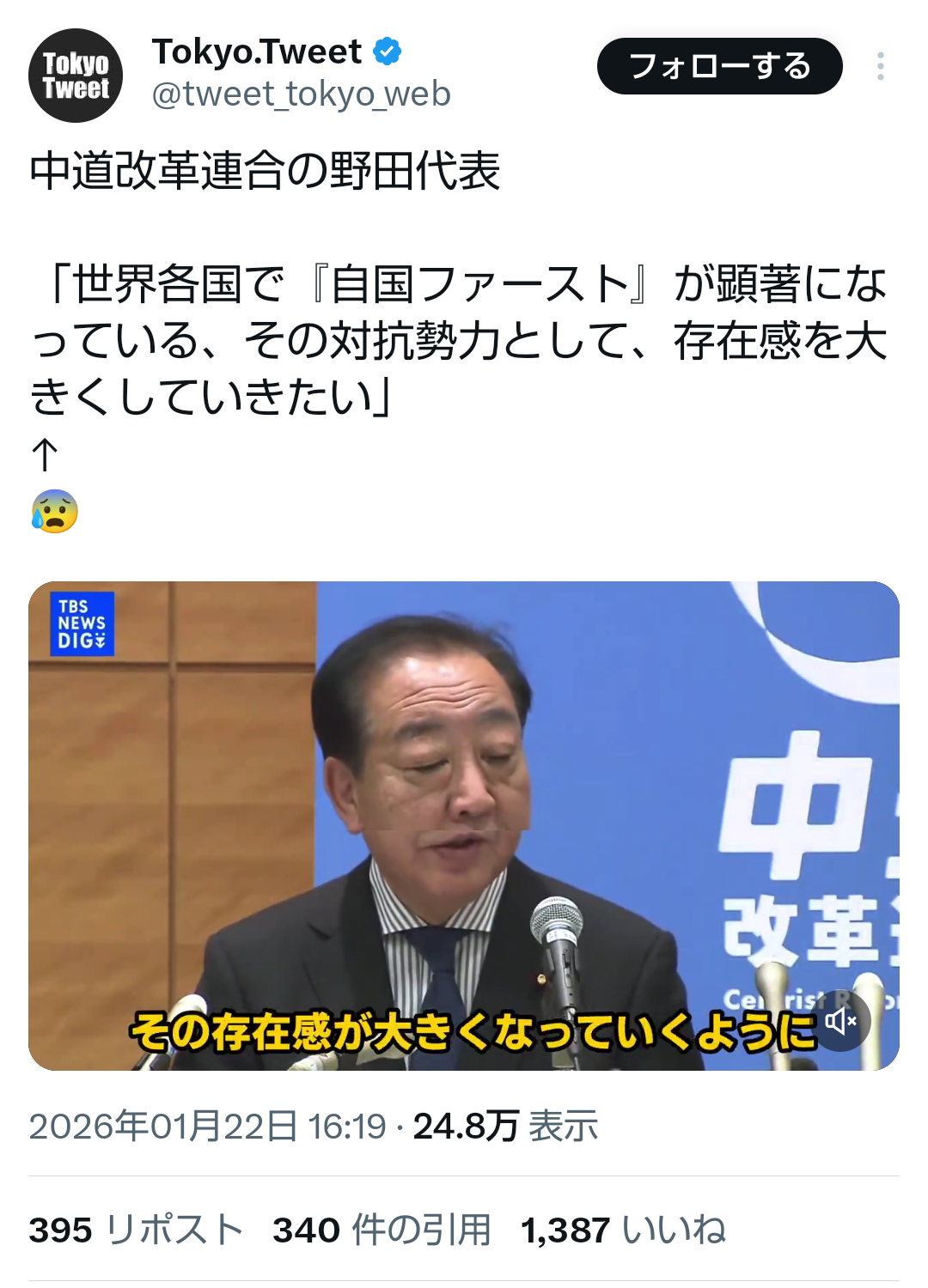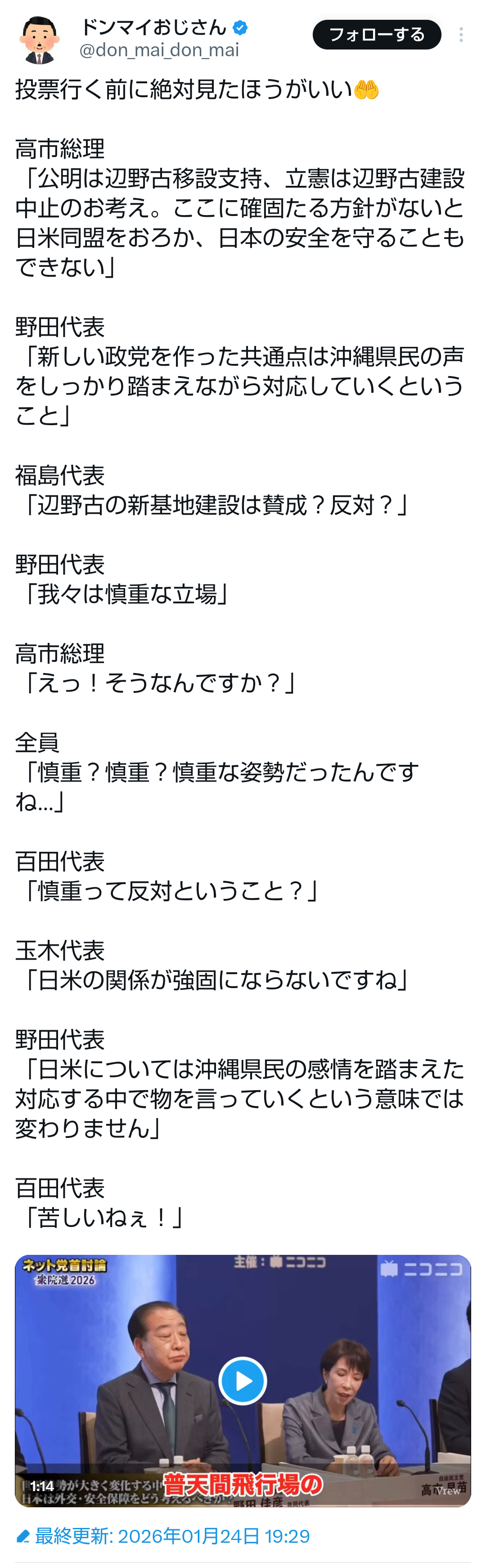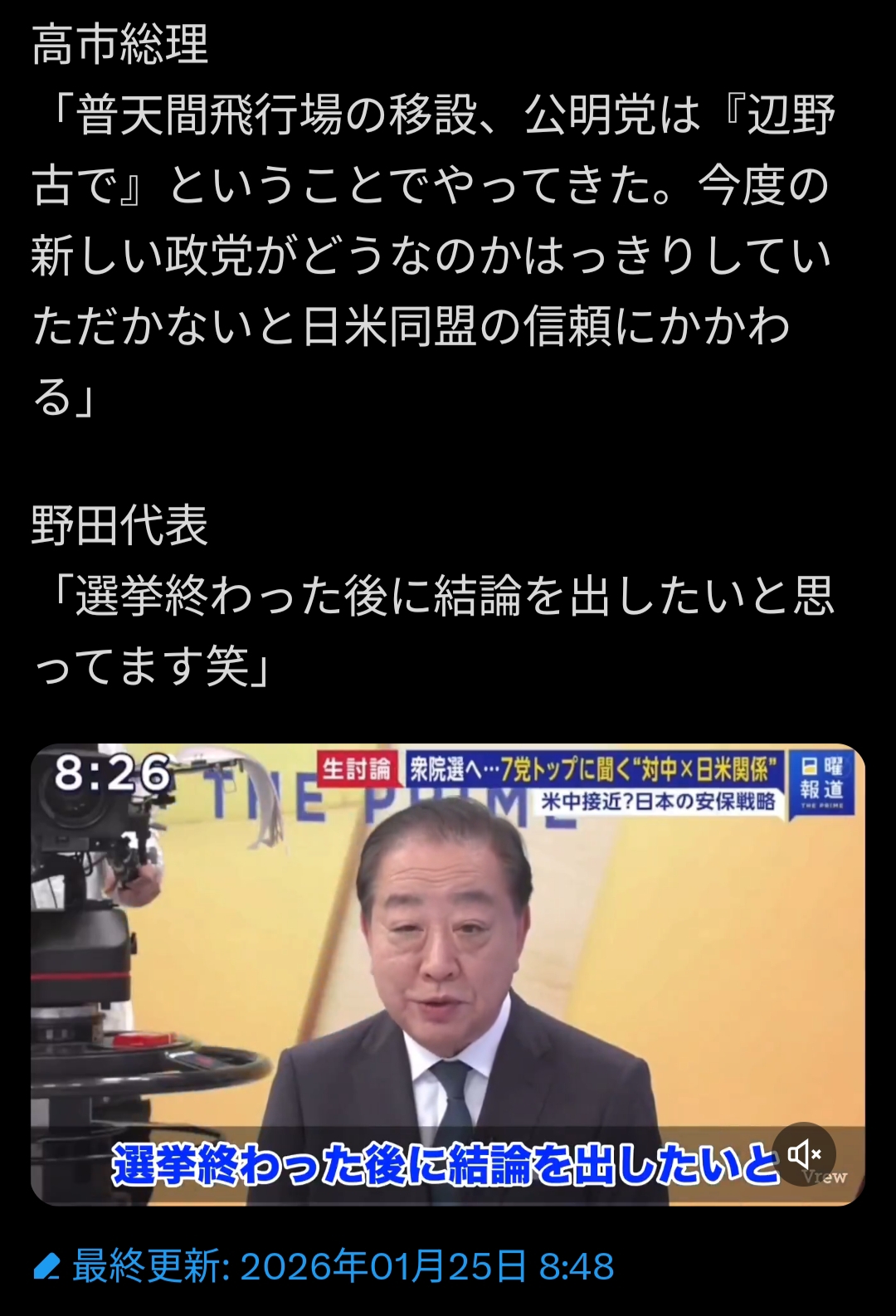 | … | 931無題Name名無し 26/01/25(日)18:37:53No.774231+ 1769333873917.png-(147624 B) >野田佳彦「1月5日解散で良かったんじゃないか」 |
