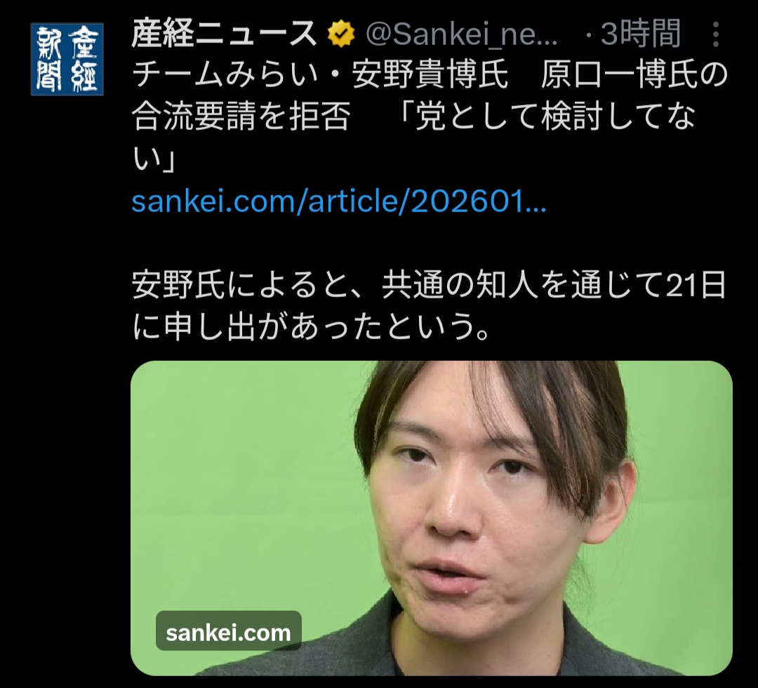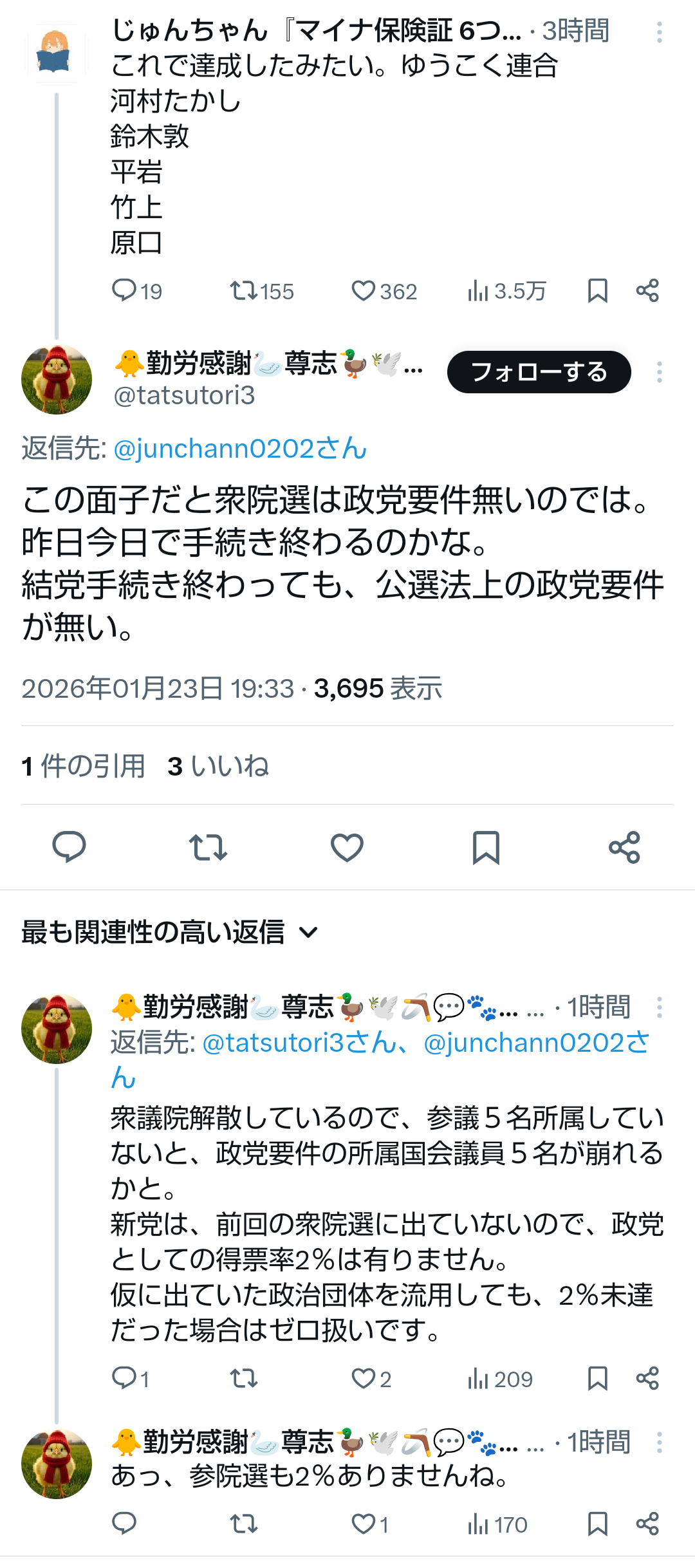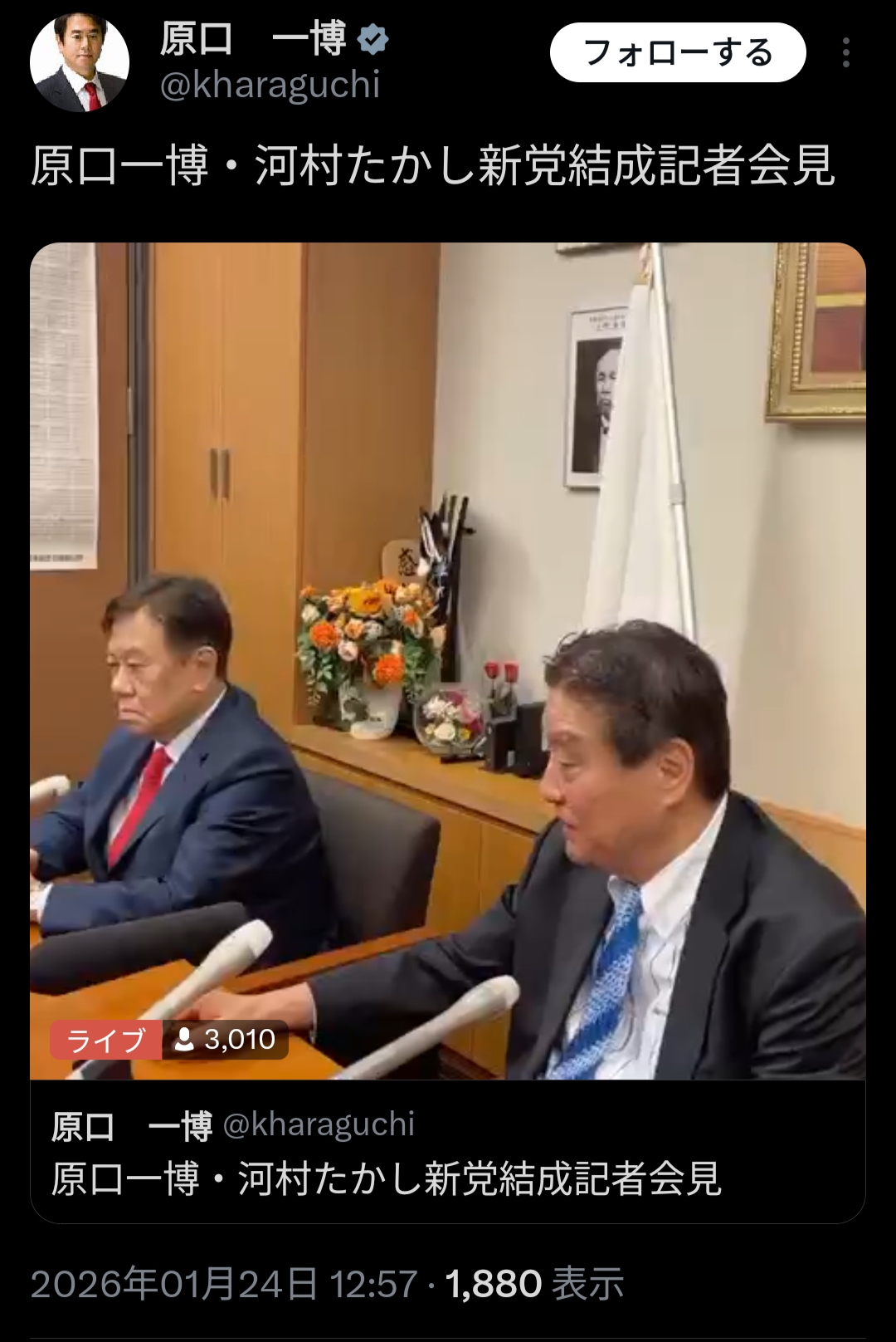 | … | 78無題Name名無し 26/01/22(木)12:39:37No.773276+原口一博氏ギブアップ「ゆうこく連合」政党要件満たせず「私の力不足」安野貴博氏にラブコールも |