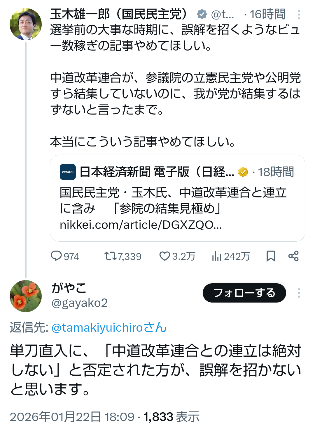 | … | 28無題Name名無し 26/01/22(木)11:35:16No.773226+>国民民は合流しない方が間違いなく票伸ばせる |