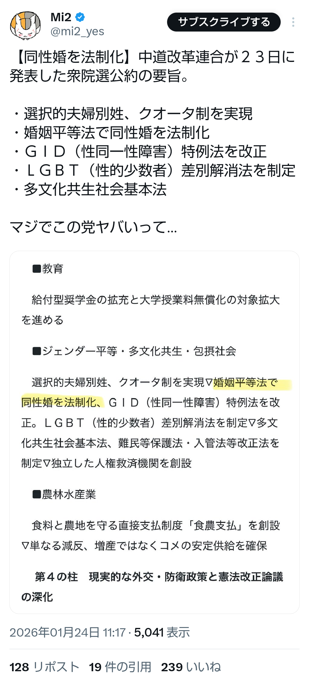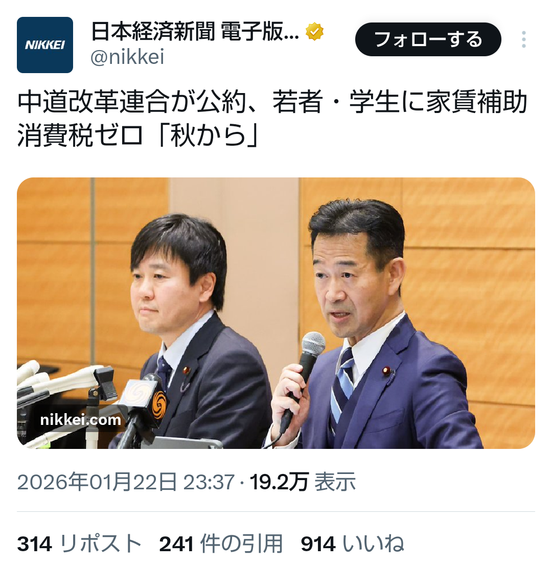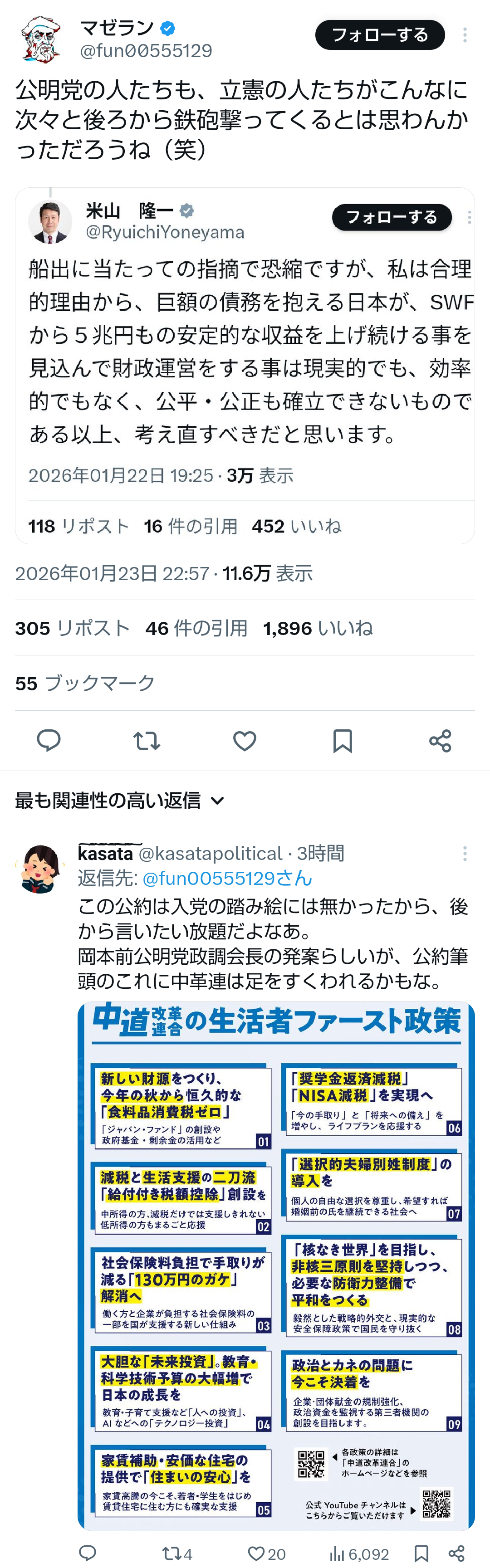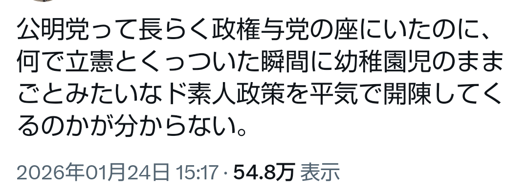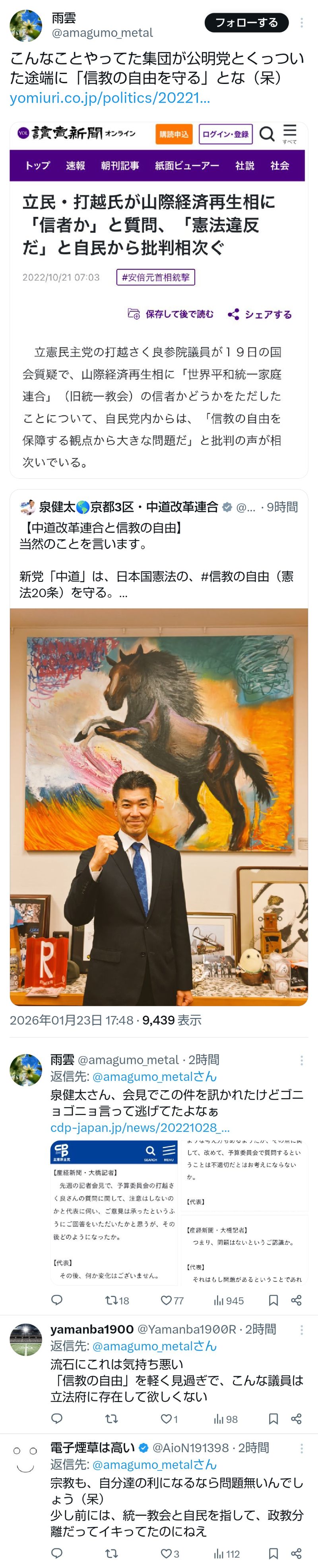 | … | 944無題Name名無し 26/01/25(日)19:10:04No.774248そうだねx1>その有能なセンセイ方も議席のためなら公明の言いなりでいいですって証文書いちゃったもんな |