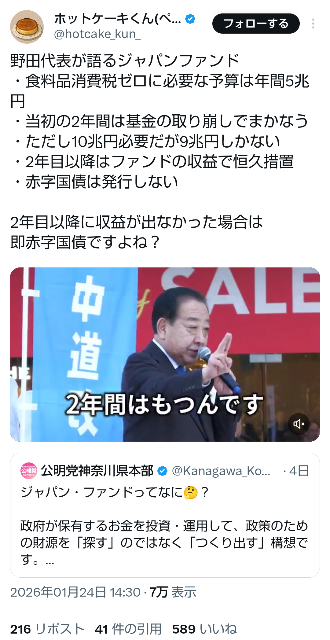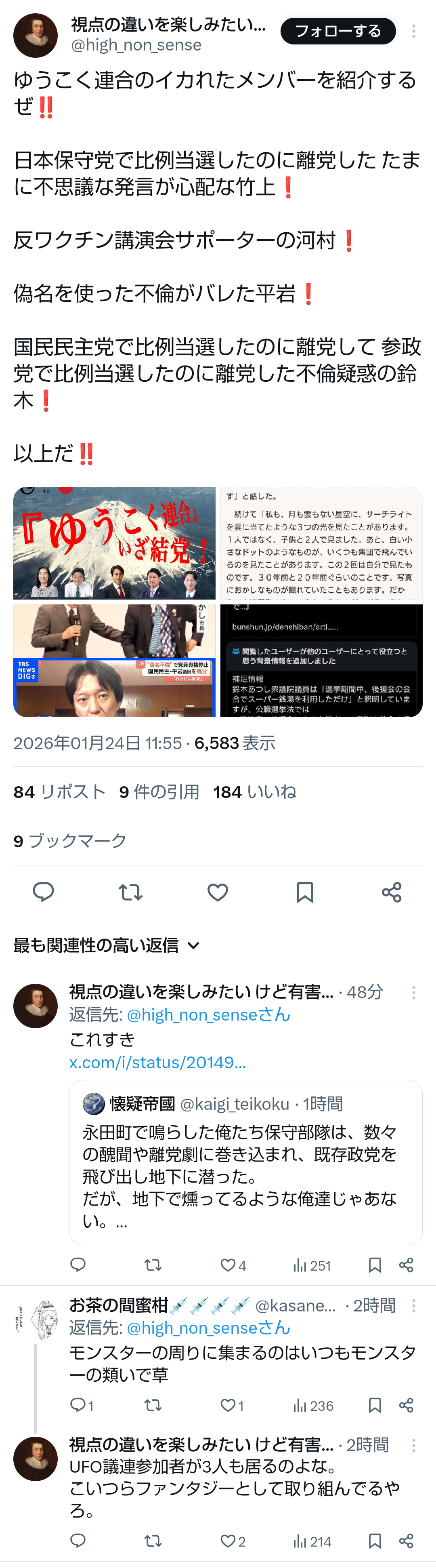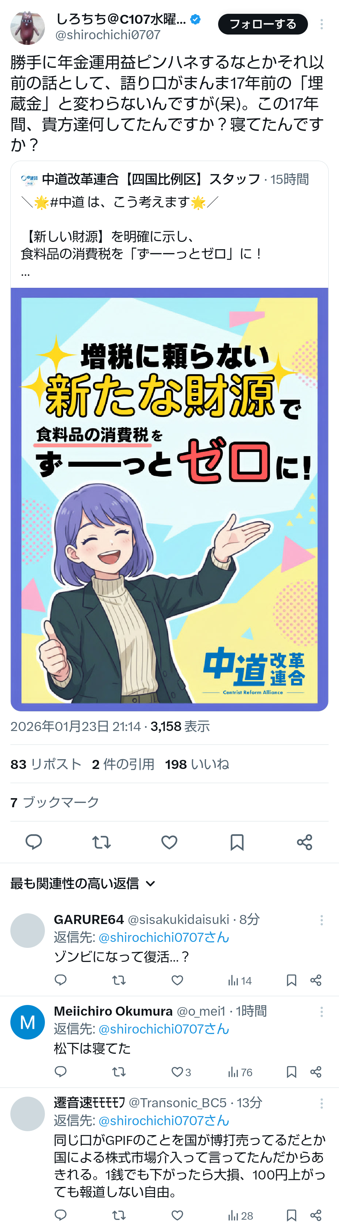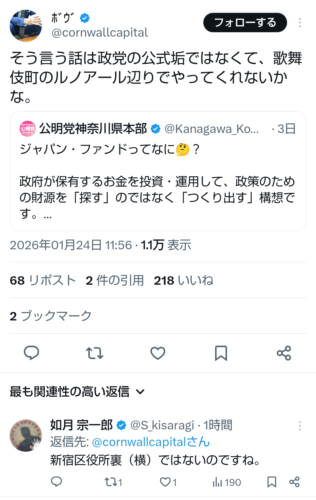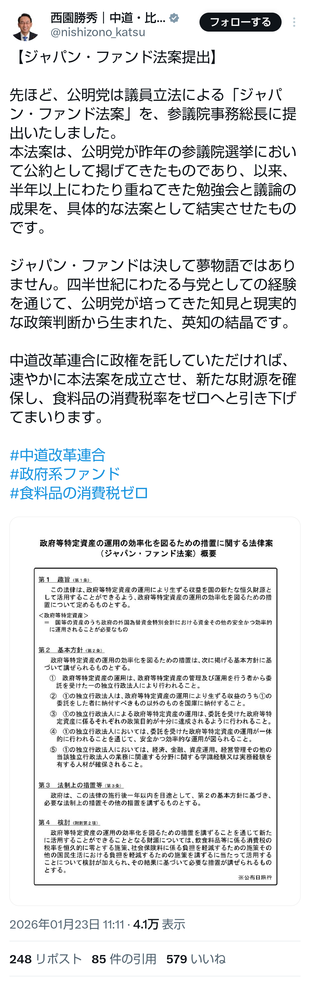 | … | 944無題Name名無し 26/01/25(日)19:10:04No.774248そうだねx1>その有能なセンセイ方も議席のためなら公明の言いなりでいいですって証文書いちゃったもんな |