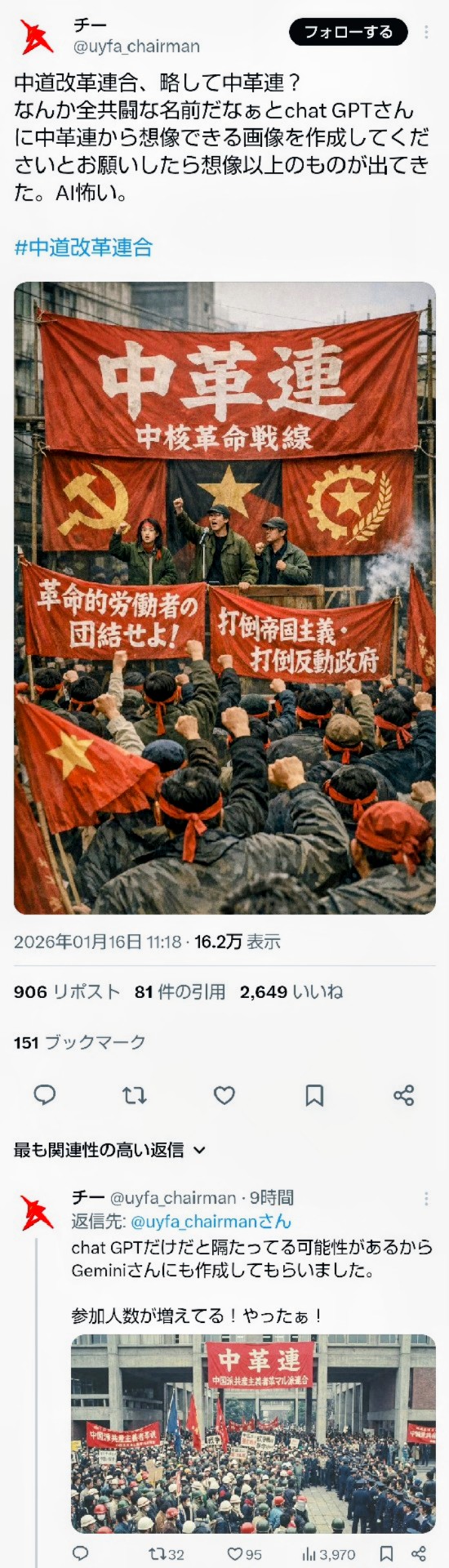 | … | 952無題Name名無し 26/01/25(日)19:16:58No.774256そうだねx1>中革は政党であって宗教団体ではないんですよ建前は |