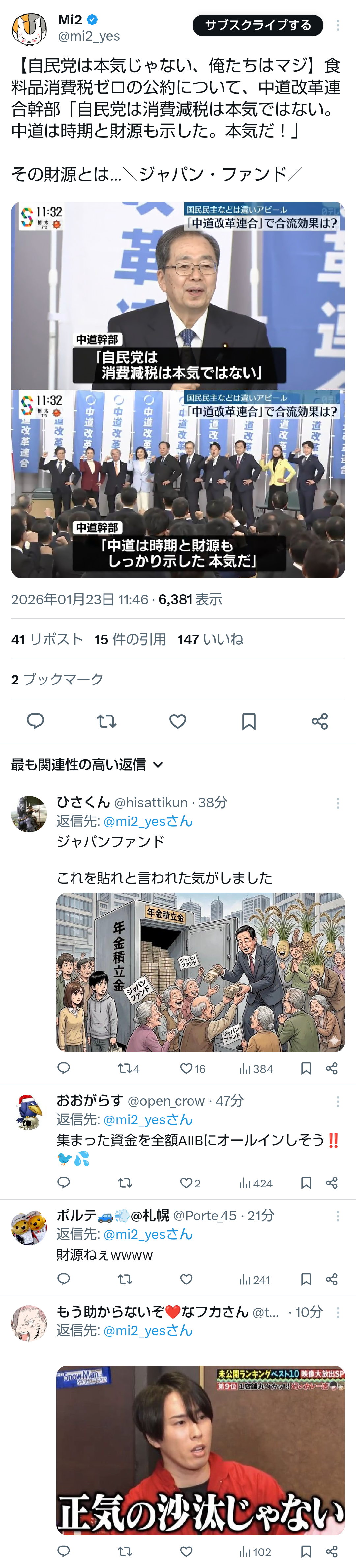 | … | 46無題Name名無し 26/01/22(木)11:51:36No.773244+>ミーには公明政権爆誕!に利用されてるようにしか見えないが |
