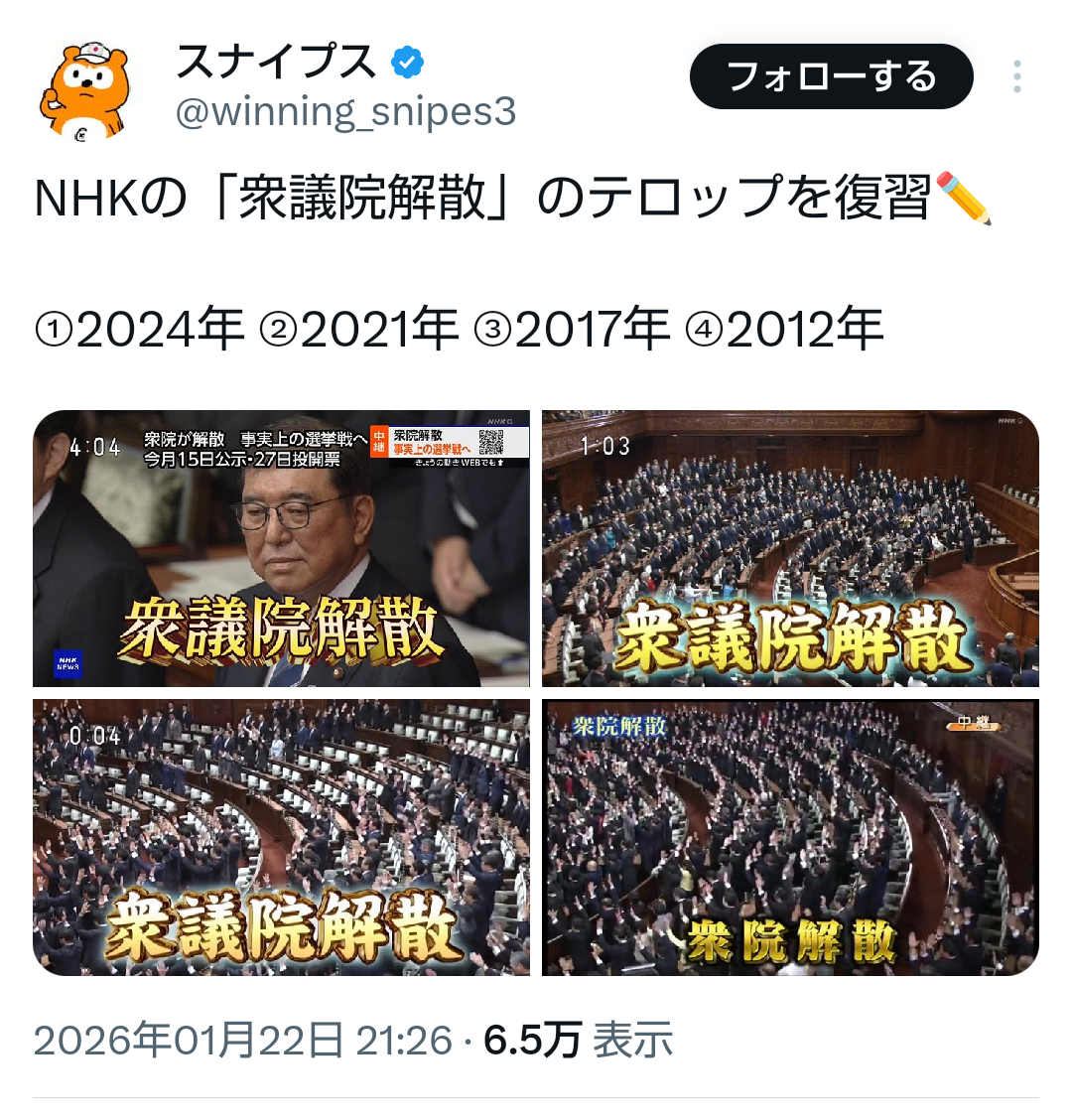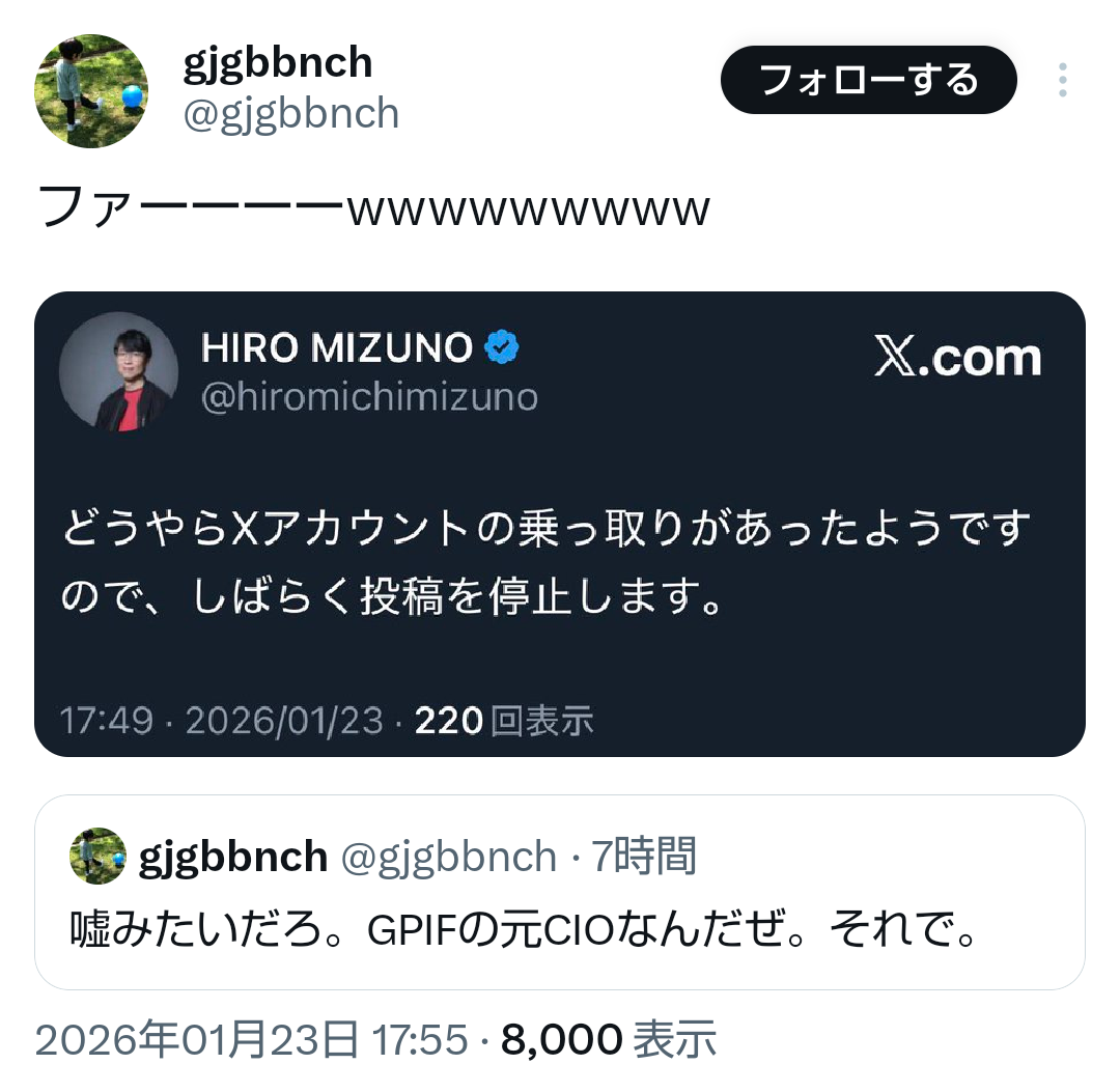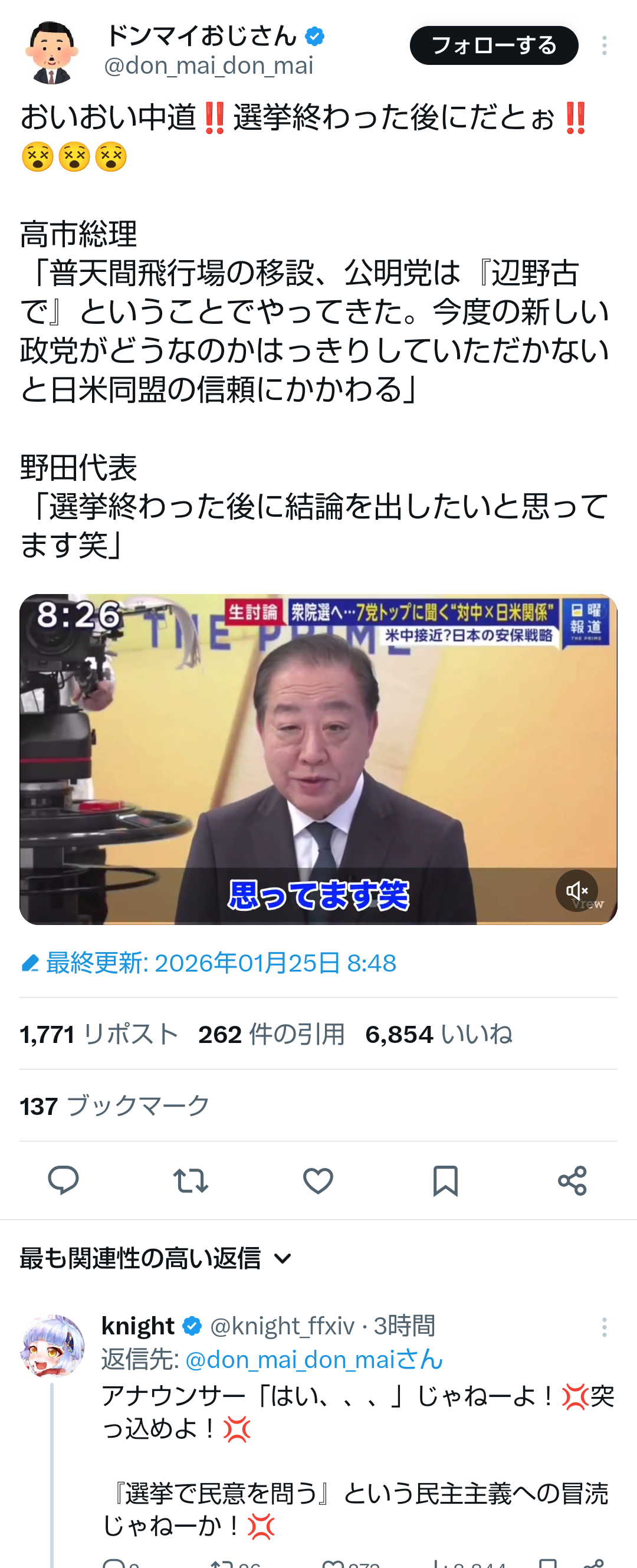 | … | 937無題Name名無し 26/01/25(日)18:58:08No.774238+>これ何で9日夜にメディアに漏れたんかね |