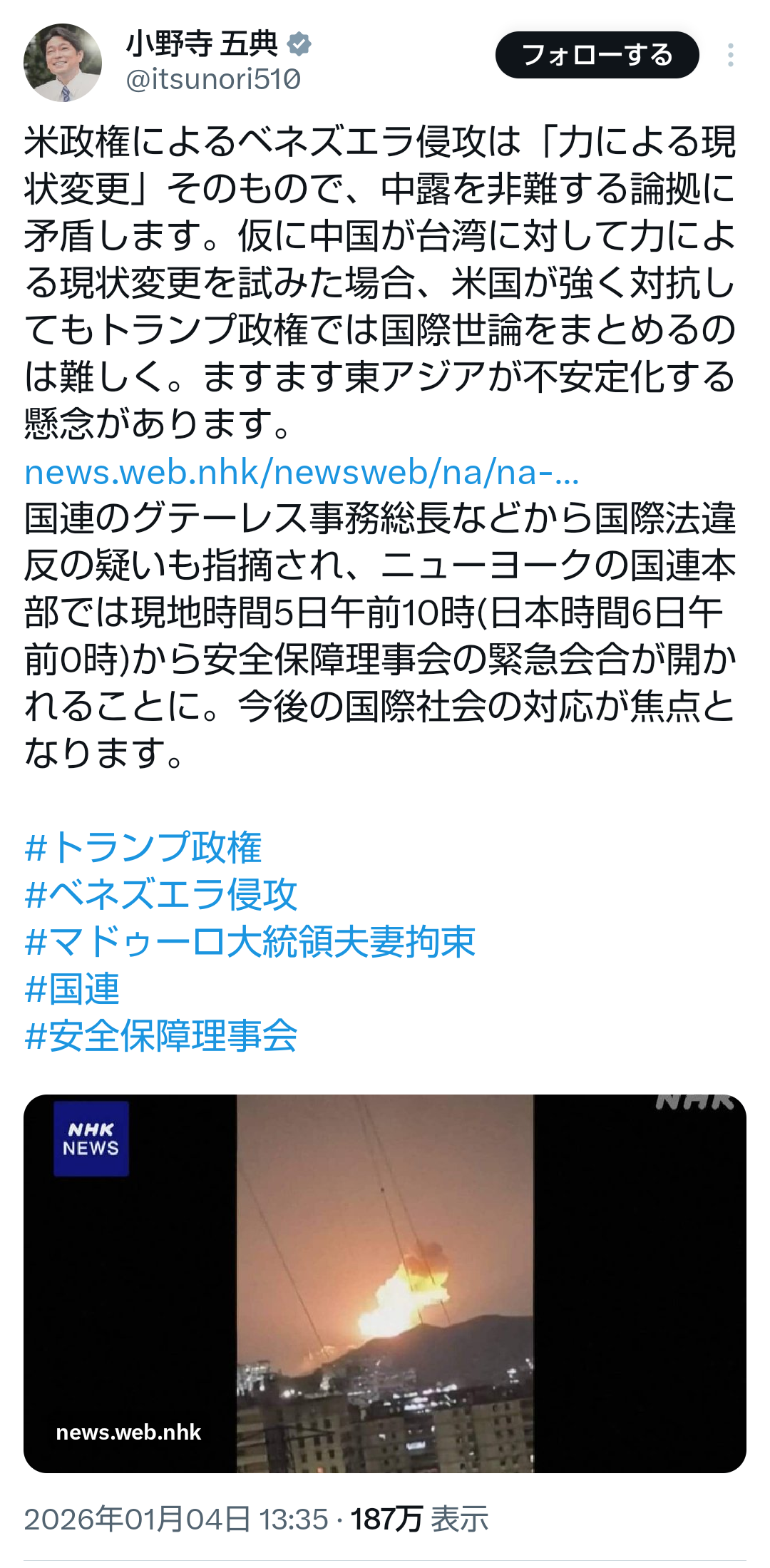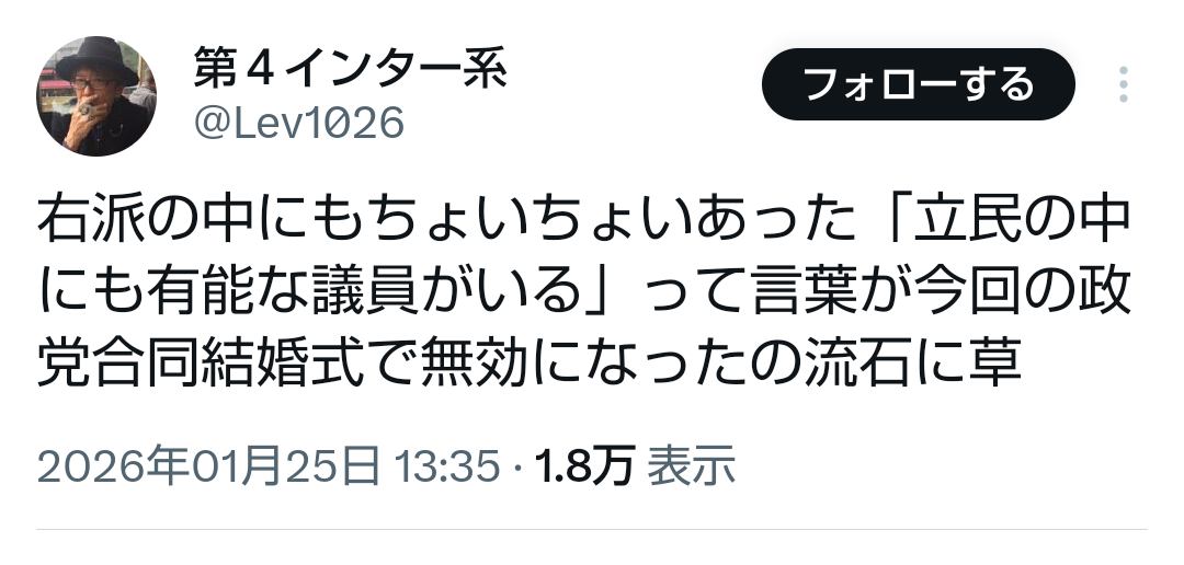 | … | 934無題Name名無し 26/01/25(日)18:52:08No.774234そうだねx1 1769334728902.png-(123319 B) >右派の中にもちょいちょいあった「立民の中にも有能な議員がいる」って言葉が今回の政党合同結婚式で無効になったの流石に草 |