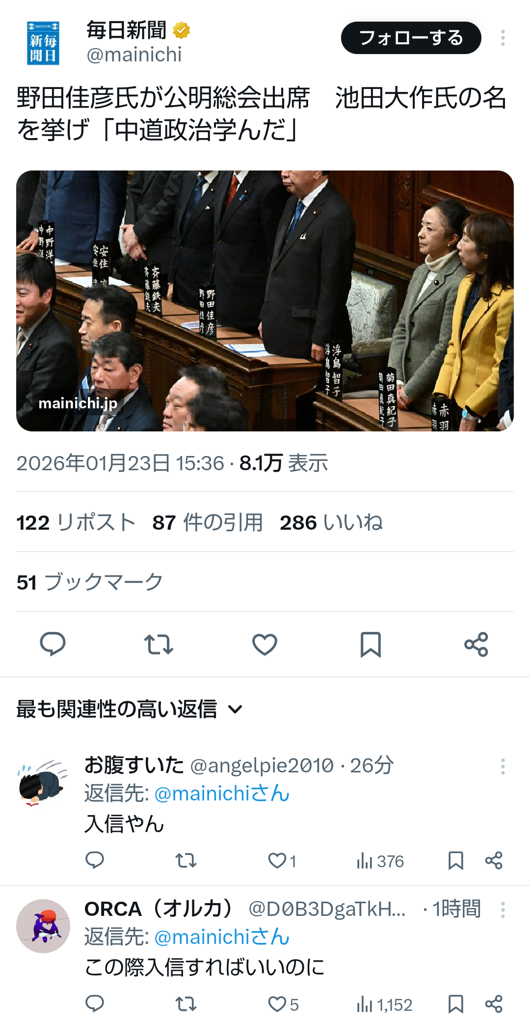 | … | 49無題Name名無し 26/01/22(木)11:58:43No.773247+>公明政権爆誕! |