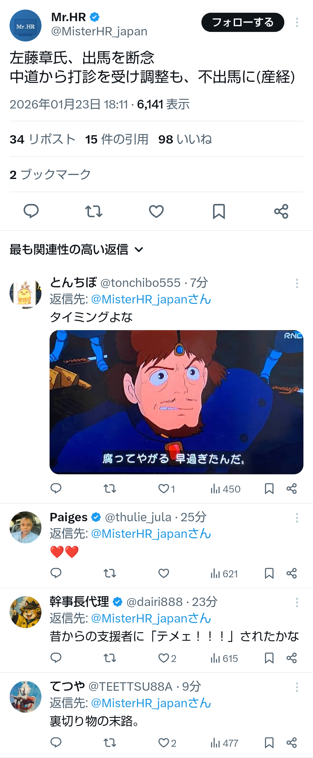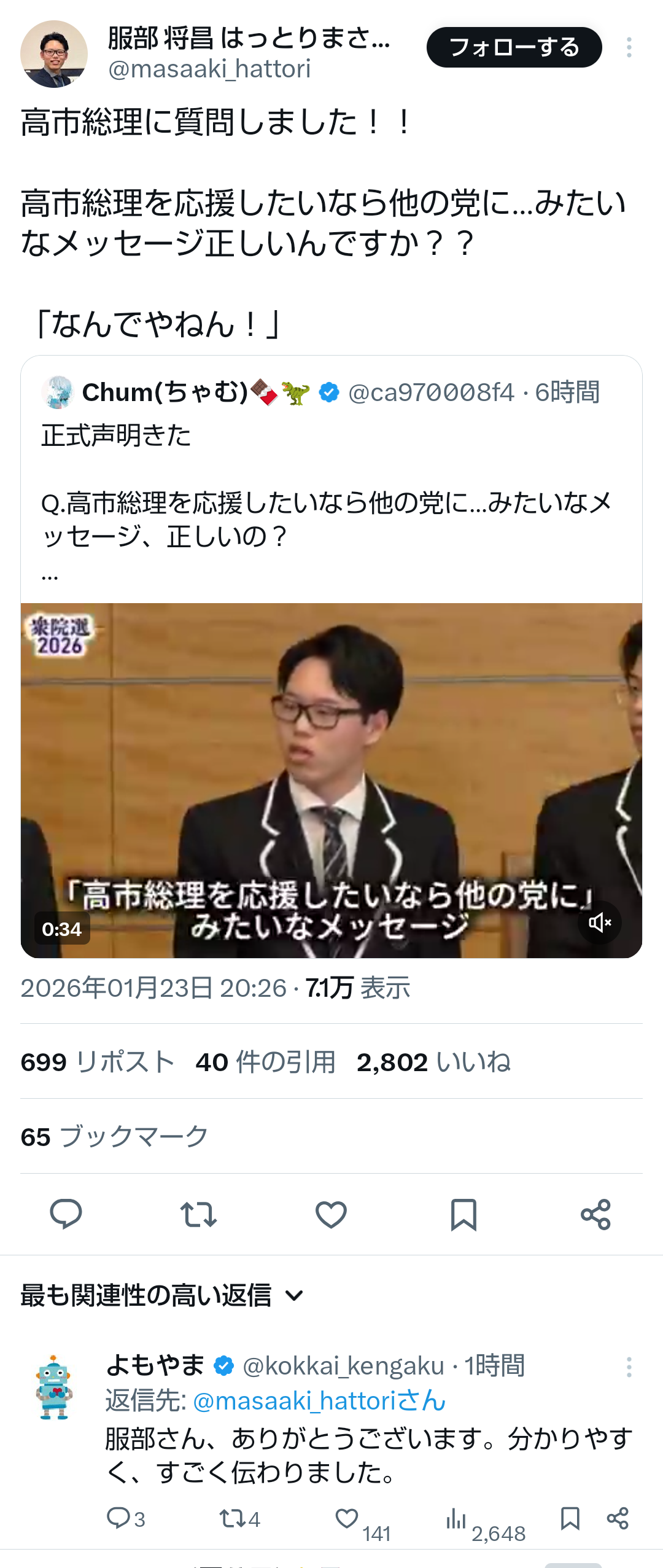 | … | 967無題Name名無し 26/01/25(日)20:45:31No.774273+与党じゃなくなったから離党しまーすをやった人の言う事は重みが違うなぁ |