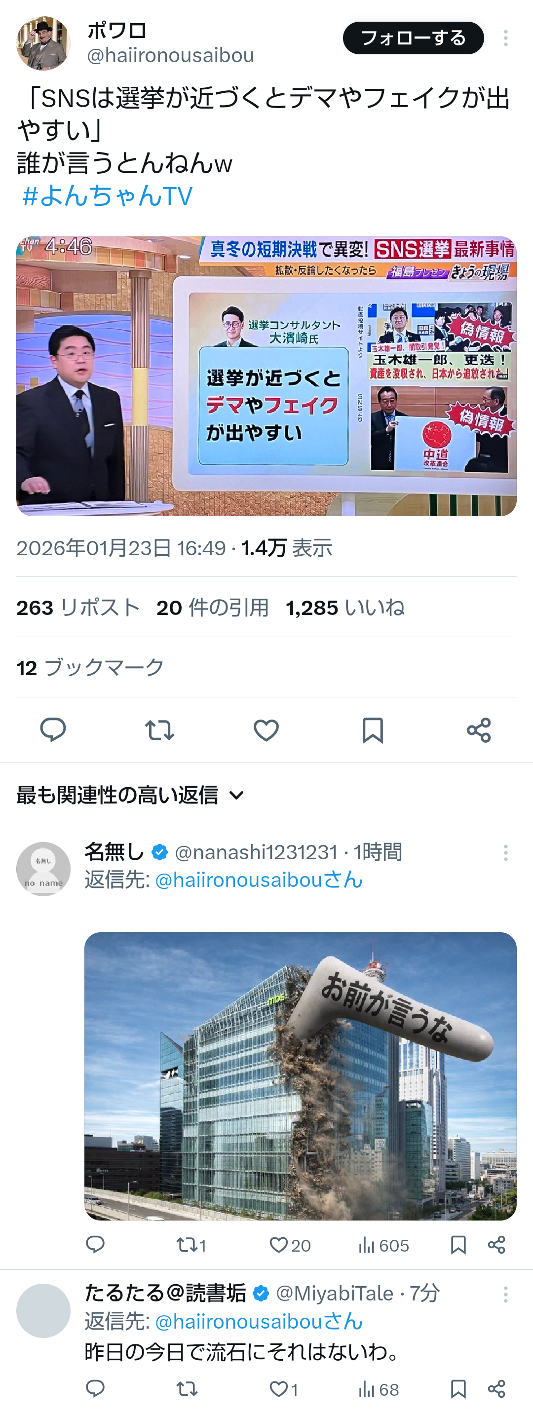 | … | 32無題Name名無し 26/01/22(木)11:38:19No.773230+選挙活動にネットの力はもはや見過ごせないだけあるのをオールドメディアは認めたくないからな |