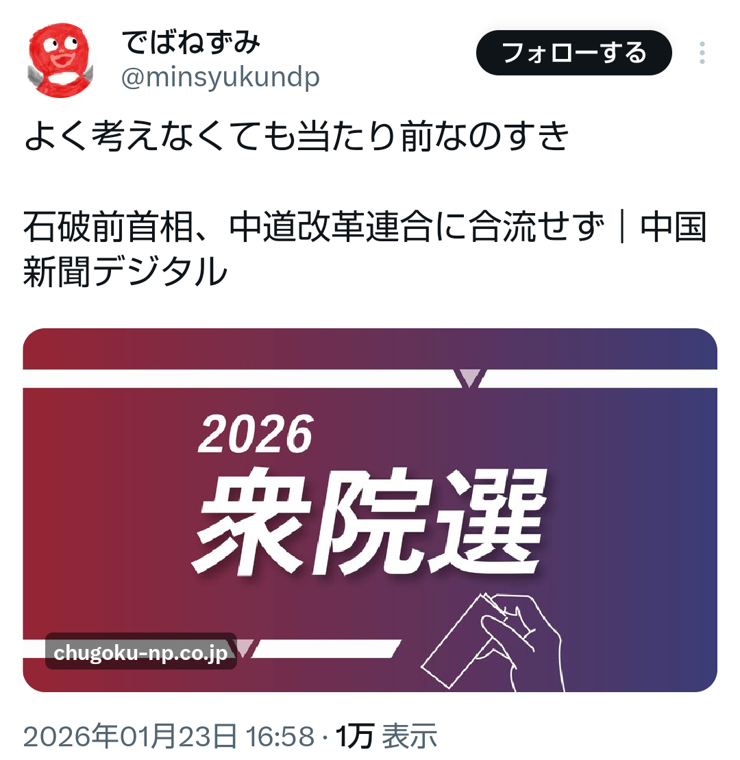| … | 27無題Name名無し 26/01/22(木)11:33:44No.773225そうだねx4>>毎日のように中道合流否定の記事出てくるな |