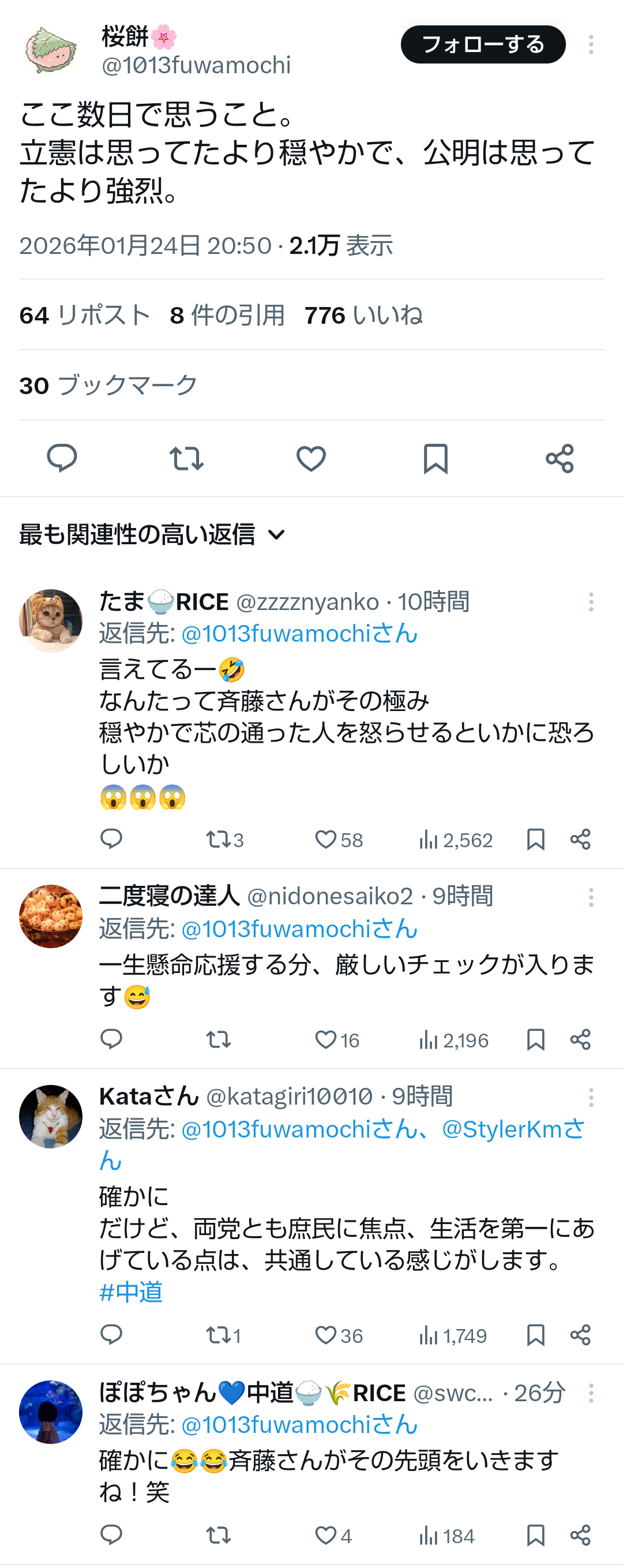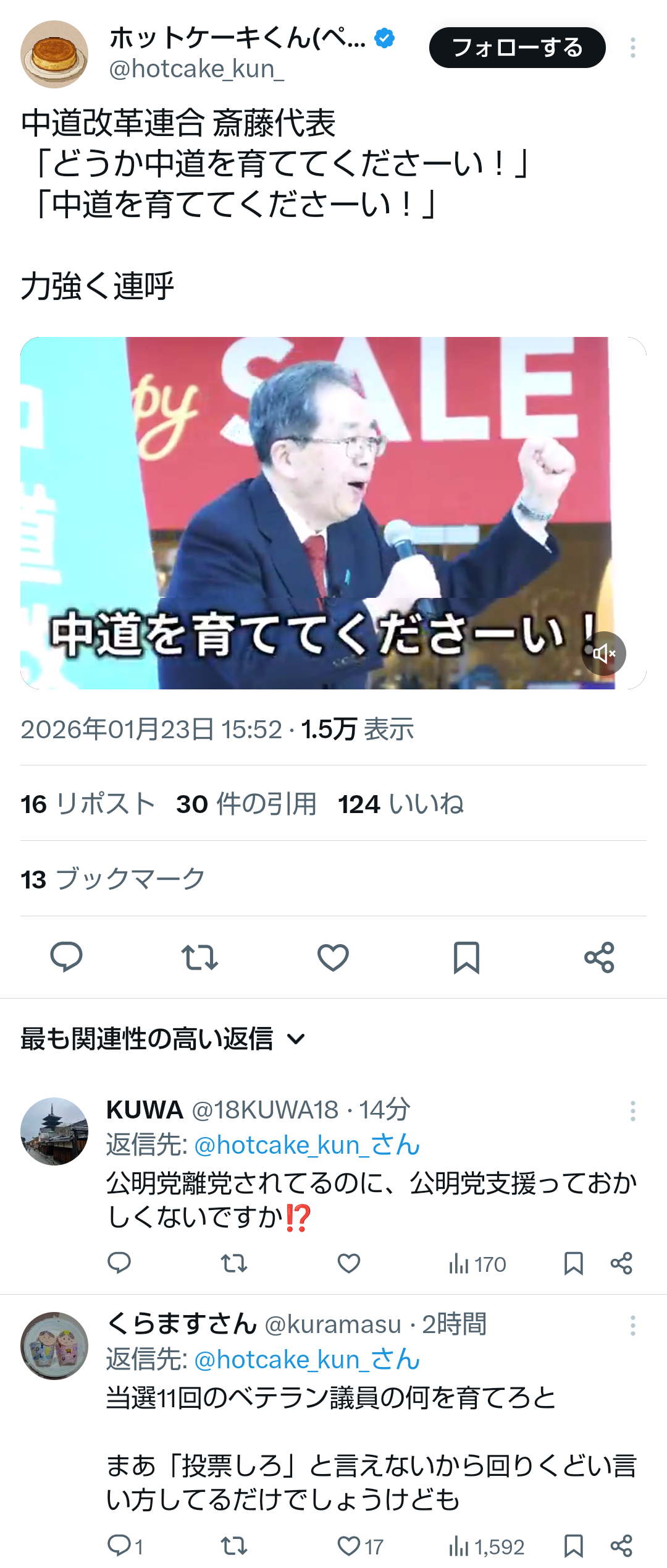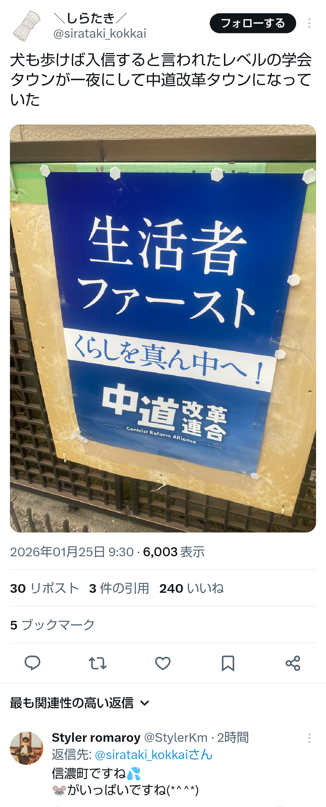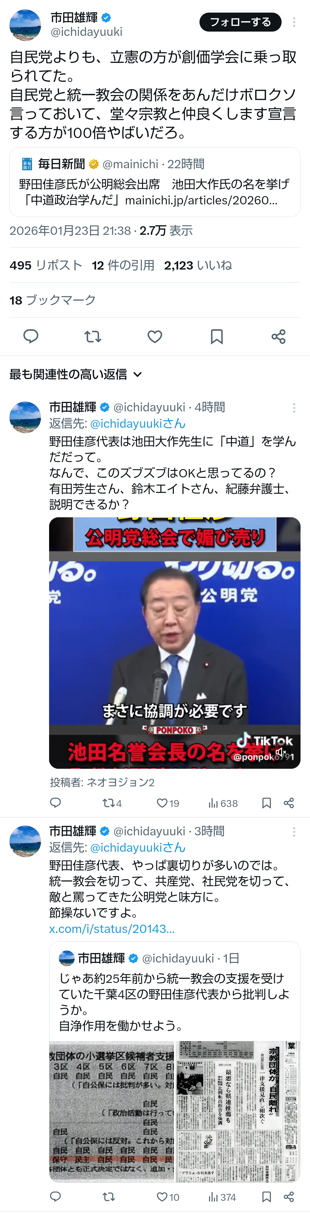 | … | 905無題Name名無し 26/01/25(日)16:51:18No.774203+>創価は中道という文言に逆らえないみたいだけど立憲支持者はどうすんのかな |