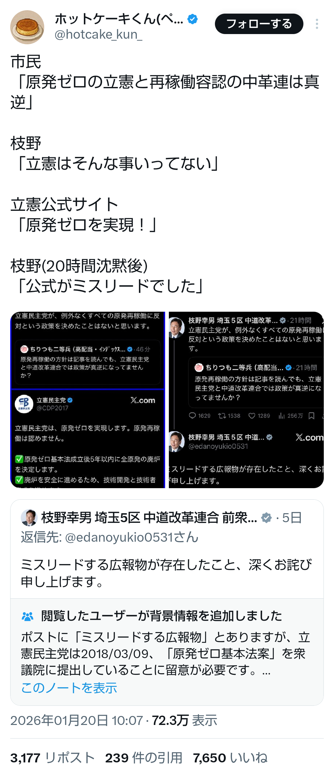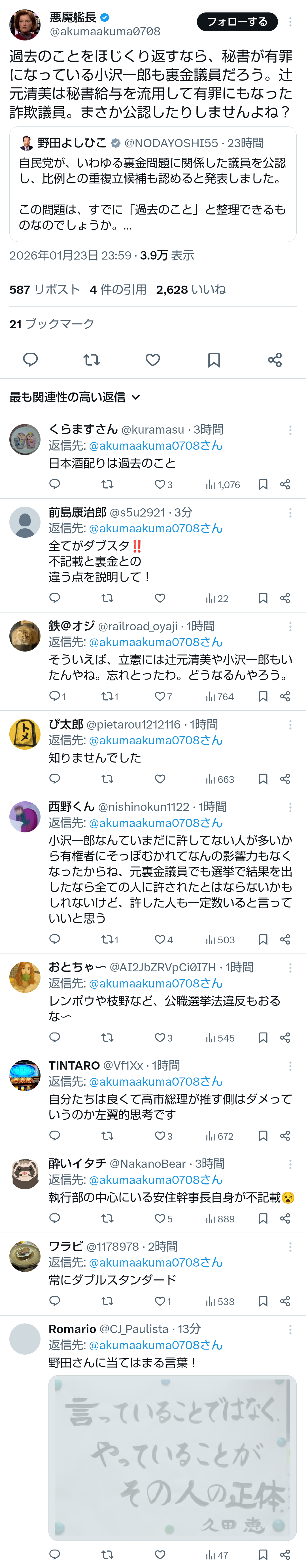 | … | 81無題Name名無し 26/01/22(木)12:48:15No.773279+2-30人剥がせる予定が野田に剥がされたと言ってたね |
