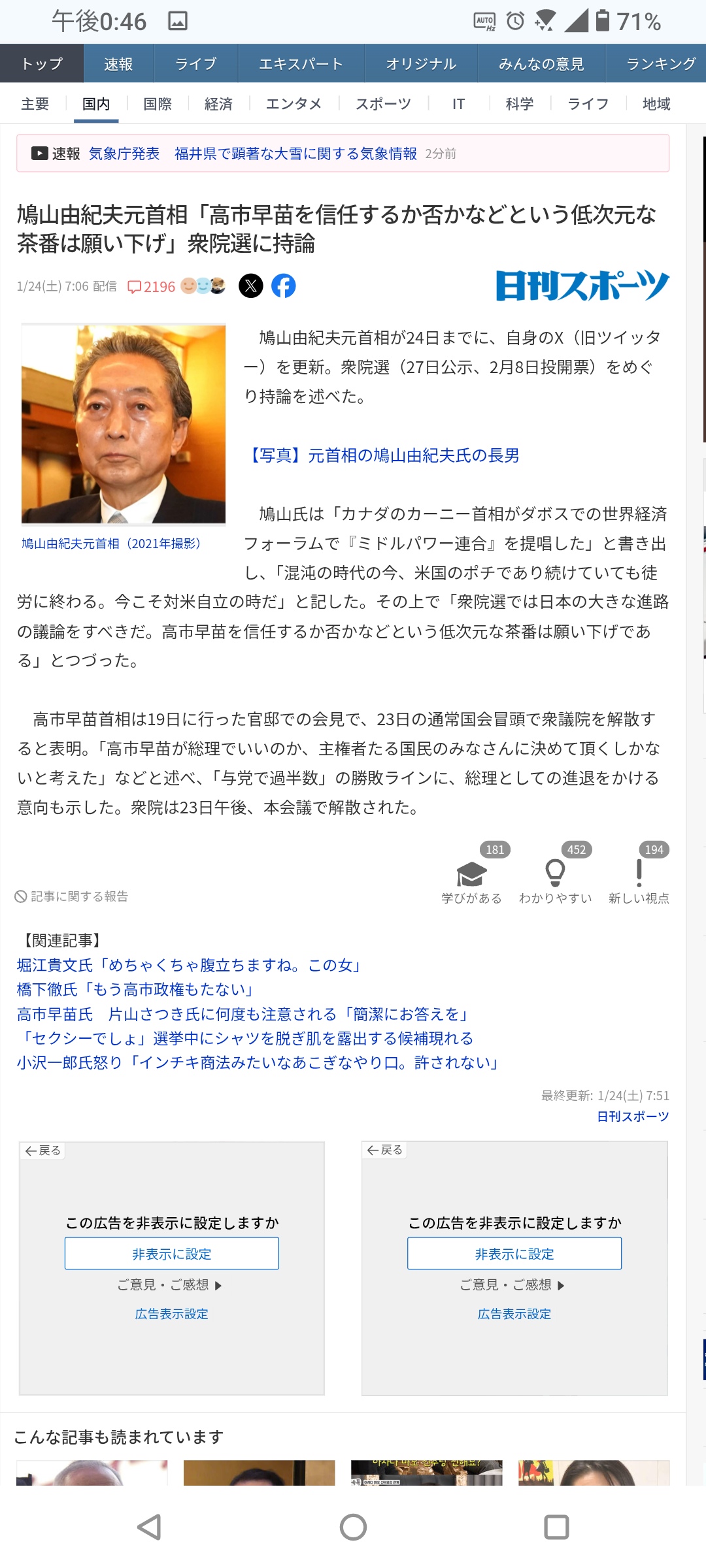 | … | 988無題Name名無し 26/01/25(日)23:33:54No.774300そうだねx2>高市首相、解散後初の週末は街頭演説なし 周辺「いろいろと忙しく」 |