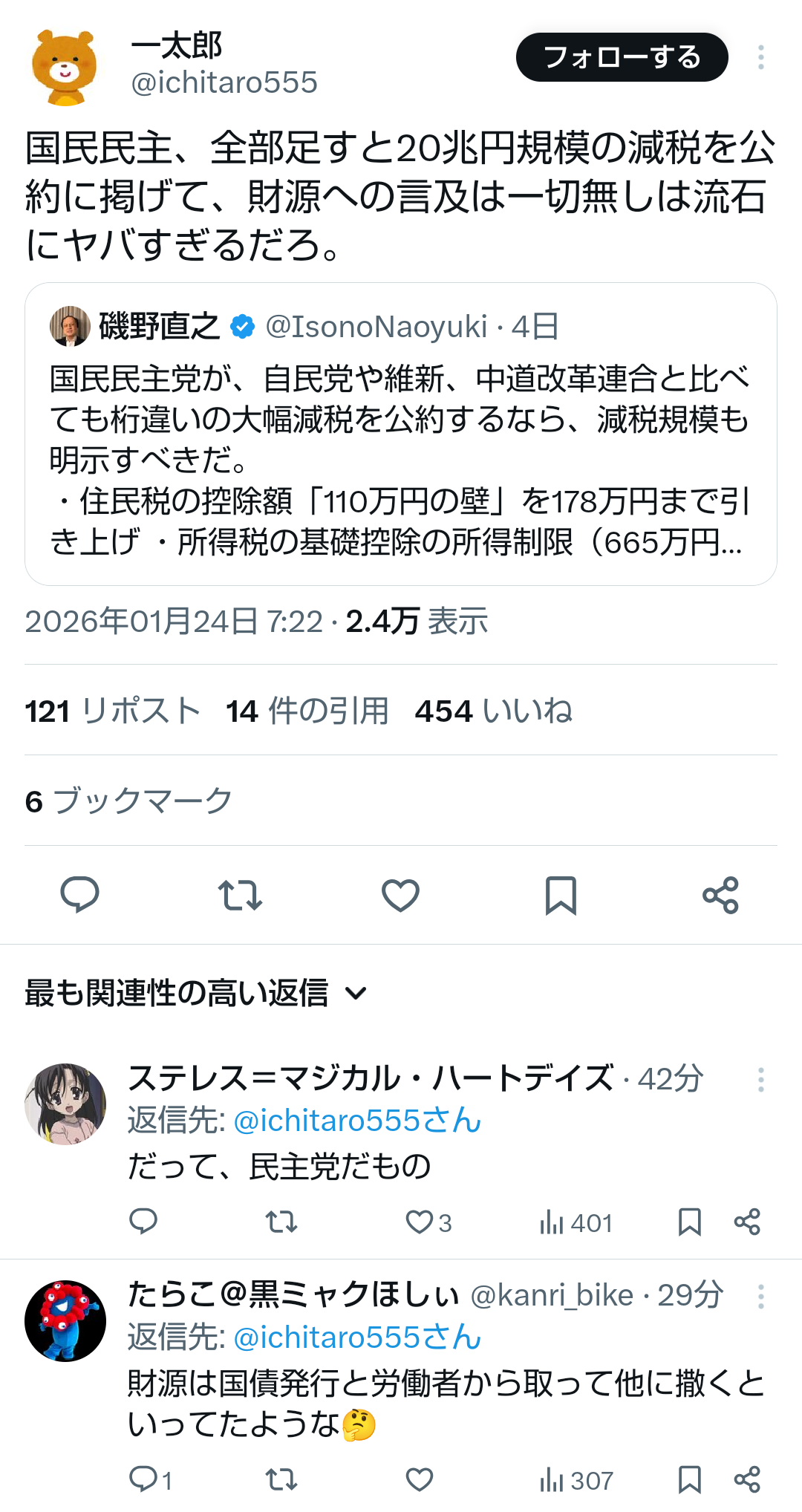 | … | 921無題Name名無し 26/01/25(日)18:12:10No.774220そうだねx4参政は自称でも保守を名乗るなら安倍路線の高市政権に多少でも同調すれば良いのに徹底して対自民党で墓穴掘るんだろうなぁ・・・ |